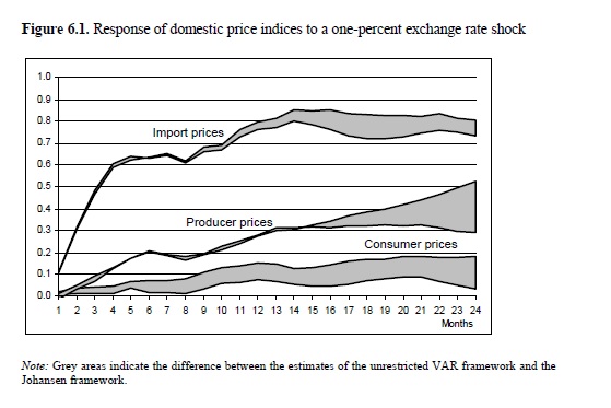 This study uses two different econometric frameworks to study exchange rate pass-through to import, producer and consumer prices in Colombia. Both frameworks are based on vector autoregressive (VAR) models, the first using an unrestricted VAR model, and t