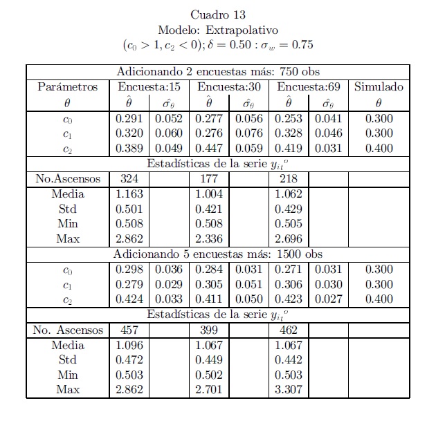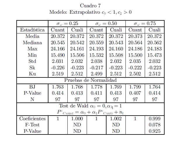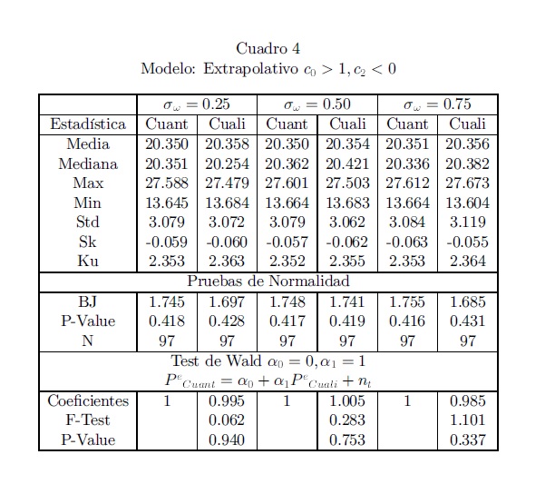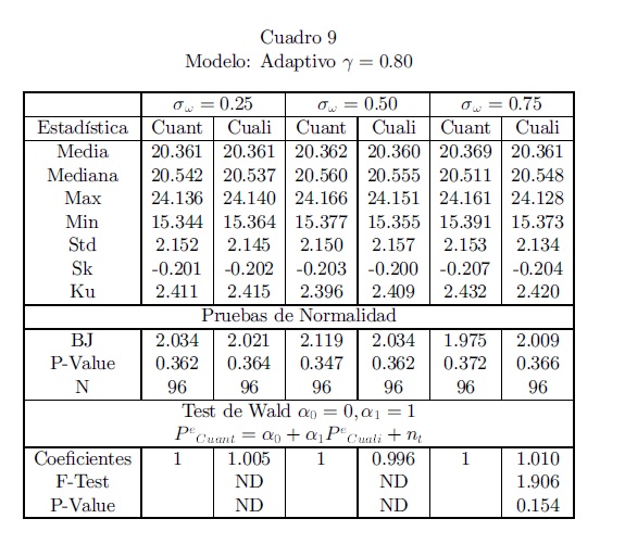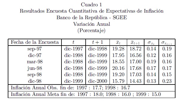 En este documento se presentan los resultados de la estimación de medidas de expectativas, así como, el desempeño de modelos probabilísticos utilizados para describir las preferencias de individuos, a partir de encuestas de carácter cualitativo, empleadas frecuentemente en la investigación de expectativas. Los ejercicios que se presentan en este documento tienen como base la extracción de la respuesta cualitativa de expectativas. La estimación de los parámetros y de las medidas de expectativas se hace a través de: Modelos Multinomiales Logísticos (MML), Modelos de Fricción, (MF), conteos derivados a partir de la respuesta cualitativa implícita en la encuesta cuantitativa y el nivel observado de la variable de referencia. El desempeño de los modelos permite concluir que a partir de la respuesta cualitativa es factible: (i) derivar estimativos similares a los que se obtendrían si se hiciese una encuesta cuantitiva, sin estar sujeto a los "indeseables efectos de valores extremos", totalmente en el caso de MML y parcialmente en el caso de MF; (ii) usar y evaluar diferentes mecanismos de formación de expectativas, desde el proceso de formación mismo y (iii) obtener medidas de concenso de la opinión de los encuestados. Los ejercicios presentados en este documento dependen significativamente del ato grado de homogeniedad, respecto del conjunto de información, que tienen los agentes que contestan la encuesta.