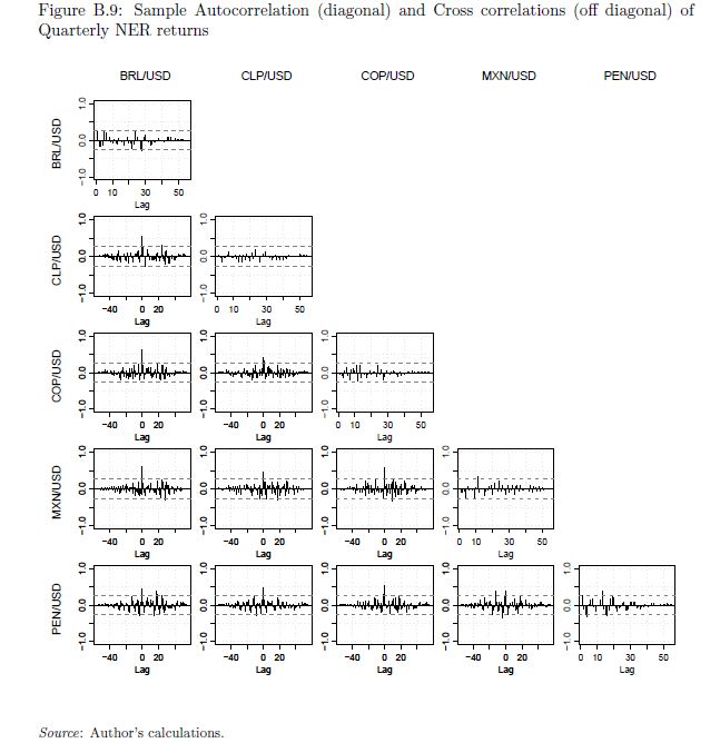 | dc.description | A la luz de literatura reciente en este escrito se interpretan los hechos estilizados más comunes de las tasas de cambio nominales en Chile, Colombia, M exico y Perú con respecto al D olar Norteamericano, y se explora un conjunto no muy conocido de estos hechos. Entre muchos otros hallazgos se encontr o que: (i) las colas de la distribuci on de los retornos ordinarios y absolutos obedecen leyes de potencia inversa, \inverse power laws", un conjunto de regularidades empíricas que ocurren con frecuencia y que parecen surgir de violaciones a los supuestos del Teorema del L mite Central y que se puede interpretar a trav z del \principio de universalidad"; (ii) la suave tendencia sinusoidal de muy largo plazo y el ruido de corto plazo de estas tasas est an dominados por un componente c clico no sim etrico con cambios repentinos de direcci on en Brazil, Chile y Colombia, pero lo opuesto ocurre en los dos pa ses restantes; y (iii) la correlaci on entre los componentes en el dominio del tiempo de distintos pa ses sugiere la existencia de factores comunes que esplican estas tasas y que pueden estar relacionados con "carry trade" y riesgos tiempo dependientes relacionados con el apetito por riesgo de los inversionistas internacionales. | spa |