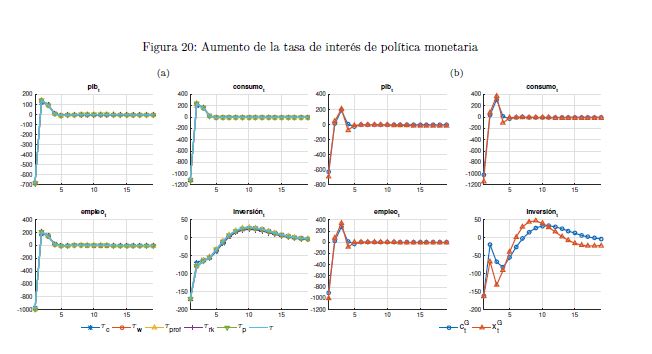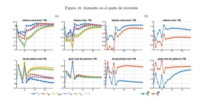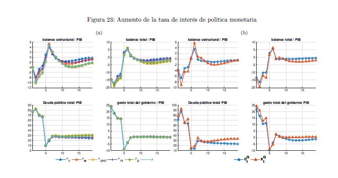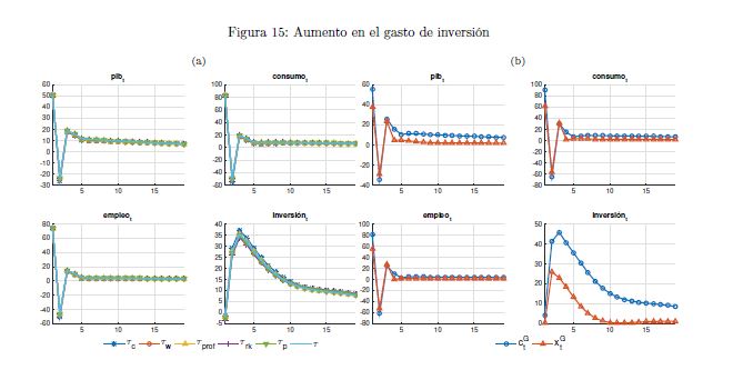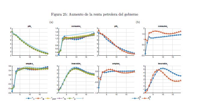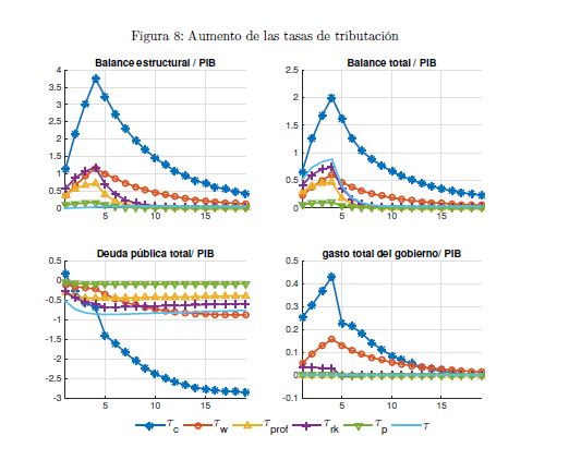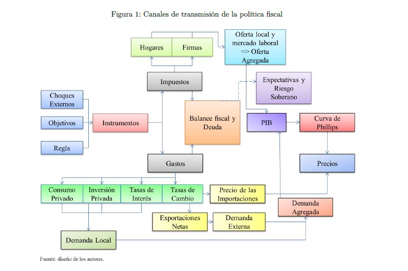 El gobierno es un agente que influye sobre la actividad económica a lo largo del ciclo y afecta las variables reales y nominales de un país por medio de sus políticas de ingreso y de gasto. También es un determinante importante de la estabilidad macroeconómica, en cuanto que esta depende, entre otros, de la sostenibilidad de sus finanzas y de la contraciclicidad de sus políticas. El objetivo de este documento es construir un modelo fiscalmicrofundamentado de equilibrio general dinámico y estocástico DSGE-neokeynesiano para Colombia (FISCO), en donde el gobierno juega un papel preponderante en la economía. El modelo se construye, calibra, estima y evalúa teniendo en cuenta sus particularidades económicas e institucionales. El propósito es que sirva como herramienta de análisis de la política fiscal y su nexo con la economía y la política monetaria. Con el propósito de evaluar las predicciones del modelo FISCO se presentan algunas simulaciones y se estudian las dinámicas de las principales variables macroeconómicas ante choques positivos y transitorios a las tasas de tributación, al gasto de funcionamiento, al gasto de inversión, a la tasa de interés de política monetaria y a la renta petrolera del gobierno. Las cinco conclusiones principales de política económica que emergen del modelo y de sus simulaciones son las siguientes. Primera, la inflación es un asunto que compete a la política monetaria, como se sabe, pero también a la política fiscal. Segunda, los choques positivos a la política fiscal son contrarrestados en cierto grado por la política monetaria; por el contrario, choques a esta última son refrendados por la política fiscal. Tercera, el choque al gasto de funcionamiento del gobierno desplaza a la inversión privada. Lo contario sucede con el choque a la inversión. En este mismo sentido, el recorte al gasto de inversión impacta en 05r medida a la economía que el ajuste al de funcionamiento. Cuarta, el balance estructural del gobierno depende del tipo de choque de política que enfrenta la economía. Quinta, la regla fiscal cumple un rol estabilizador de las finanzas del gobierno y de la economía, como es su objetivo; sin embargo, puede convertirse a la vez en un agravante de la situación macroeconómica ante ciertos choques.