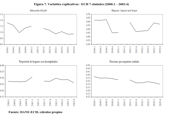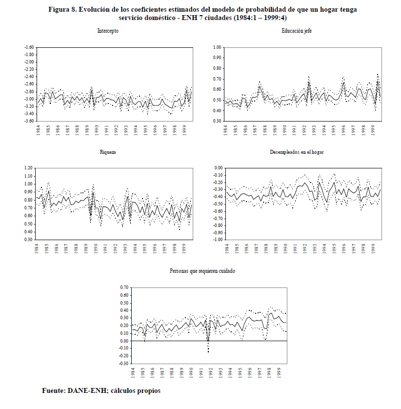 Entre 1984 y 2002 se presentó una caída permanente en la proporción de hogares colombianos que utilizan personal asalariado para trabajo doméstico ("servicio doméstico"). Para estudiar este hecho utilizamos un modelo teórico de la decisión del hogar de tener o no tener servicio doméstico, y realizamos una estimación econométrica de tal probabilidad. Dicha probabilidad se ve afectada no sólo por las decisiones de demanda de los hogares sino también por las de oferta de las personas dedicadas a este oficio. Las variables explicativas del modelo son el nivel educativo del jefe del hogar en relación con el del servicio doméstico, el número de desempleados en el hogar, la riqueza del mismo y el número de personas que requieren cuidado (personas incapacitadas e inválidas, personas en la primera infancia y 05res de 80 años). Todas las variables son significativas a lo largo del período de estudio 1984-2002 y tienen el signo esperado. En materia de pronóstico el modelo se desempeña bien. La fuente de la información es el conjunto de todas las etapas de la Encuesta Nacional de Hogares y de la Encuesta Continua de Hogares para las siete 05res ciudades.