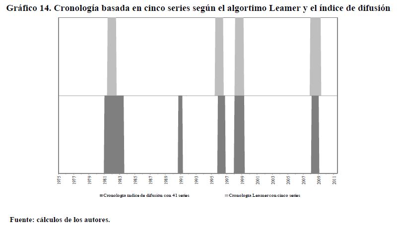 Se propone una cronología para los ciclos de negocios de Colombia en la concepción clásica del NBER; esto es, determinando las fechas de picos y valles en la actividad económica sin separar las series utilizadas en sus componentes transitorio y permanente. La cronología estimada sugiere que los cuatro ciclos completos que se han presentado entre 1975 y 2011 son asimétricos y tienen una duración aproximada de 6,8 años. Las expansiones duran en promedio 5,4 años mientras que las contracciones tardan 1,3 años. Los resultados se derivan de la utilización del índice de difusión acumulado con 41 series.