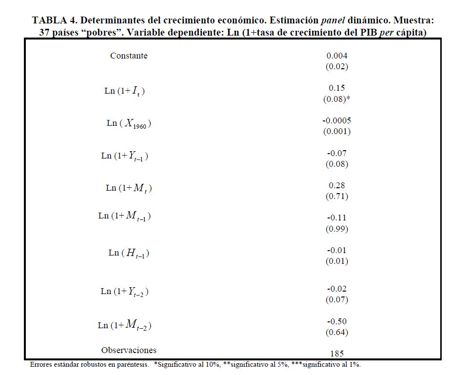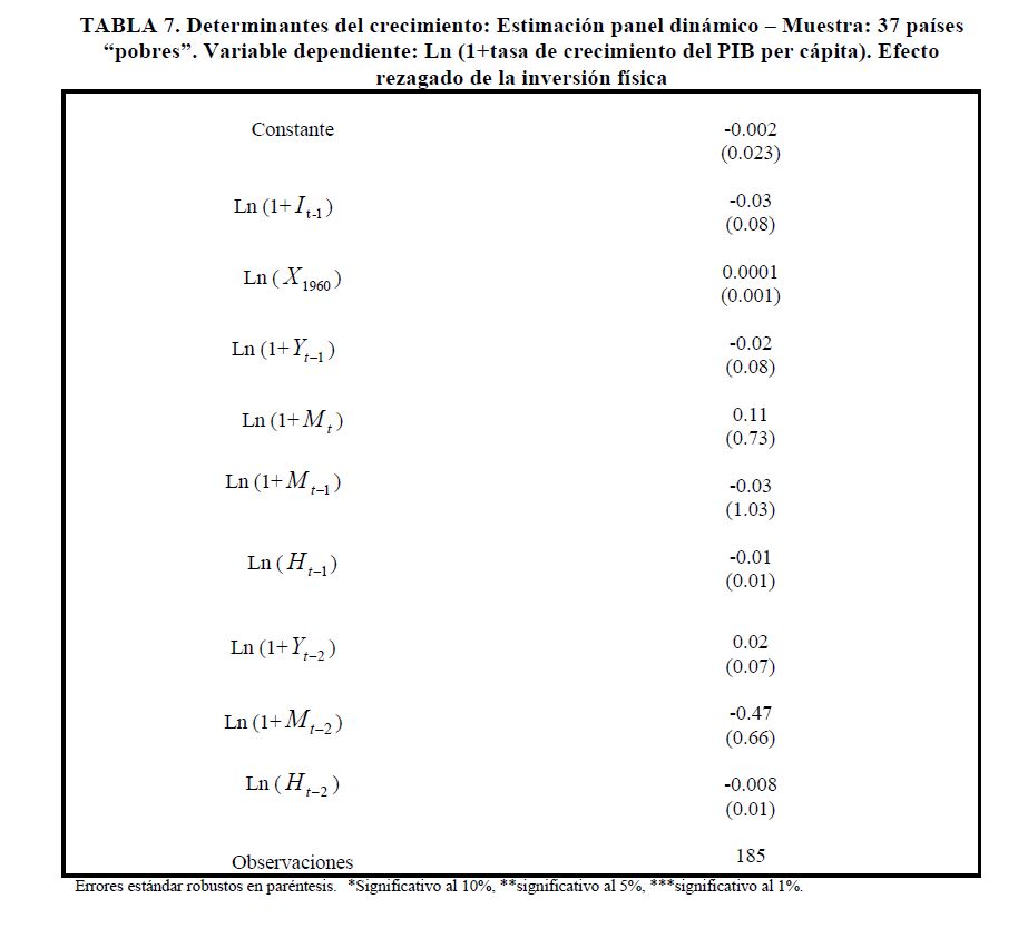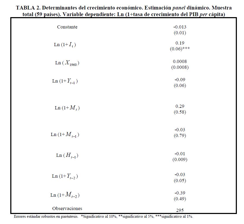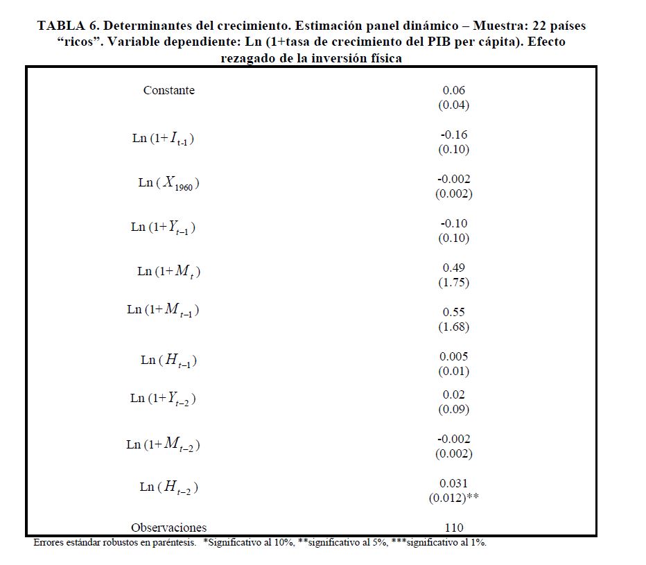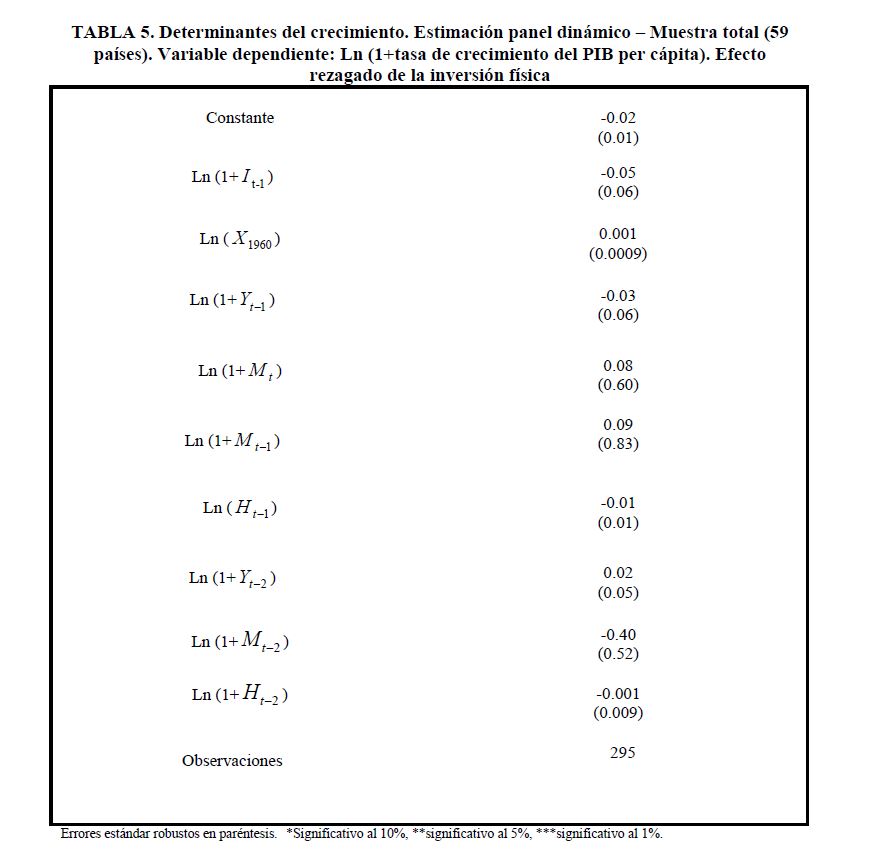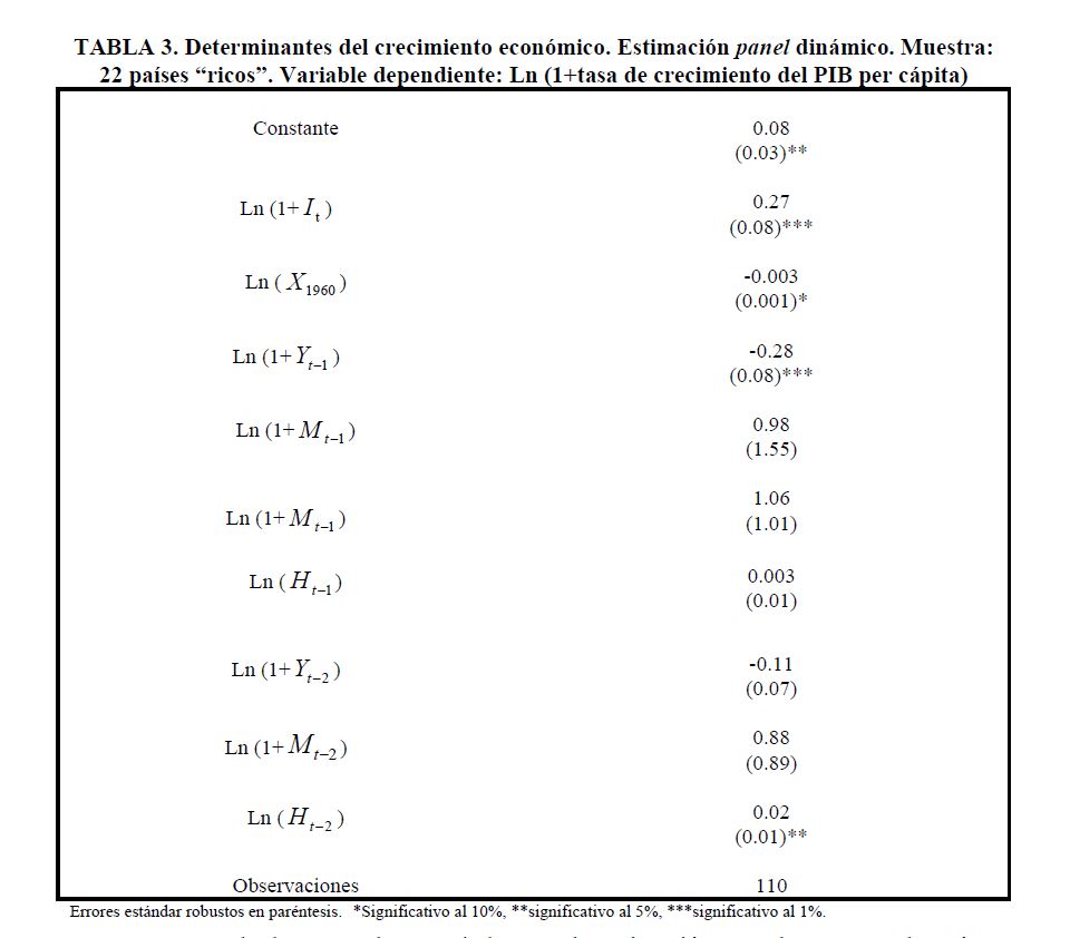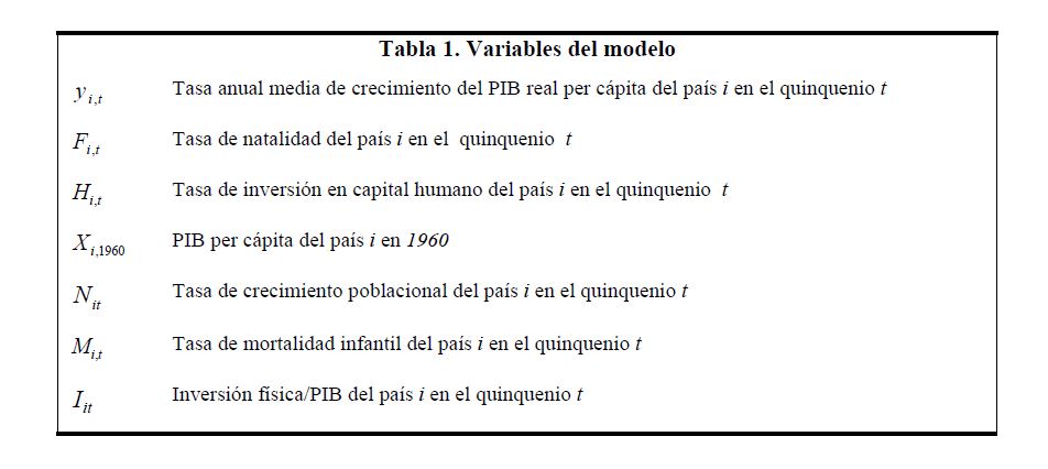 En este ensayo presentamos un modelo de crecimiento económico y los resultados de su estimación econométrica. Entre sus variables incluimos las demográficas y de capital físico y humano. El ejercicio empírico se basó en un "panel dinámico" que cubrió un período de aproximadamente cuatro decenios (1960-2000) y tres muestras de países con el fin de apreciar la robustez de los resultados. La primera, con 59 países, y, las otras dos, diferenciando entre países pobres y ricos. Los resultados de la muestra total parecen dominados por los de la sub-muestra de países pobres, a saber: solo la tasa de inversión en capital físico fue significativa en la determinación de la tasa de crecimiento económico. En el caso de los países ricos, además de la inversión en capital físico, también se mostraron significativas la inversión en capital humano (con un efecto rezagado de 10 años) y la constante, sugiriendo, esto último, que fue importante en estos países un cambio técnico exógeno como uno de sus motores de crecimiento.