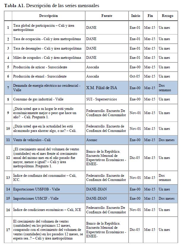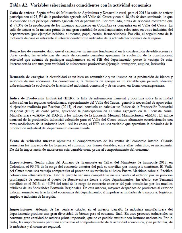 This paper takes as its starting point the work of Stock and Watson (1991) and this is applied in a regional context. From seven key time series of the department of Valle del Cauca in Colombia in the period January 2000 to March 2015, a monthly coinciden
