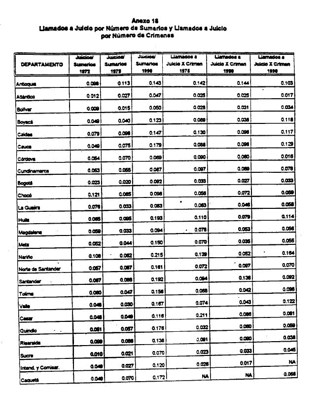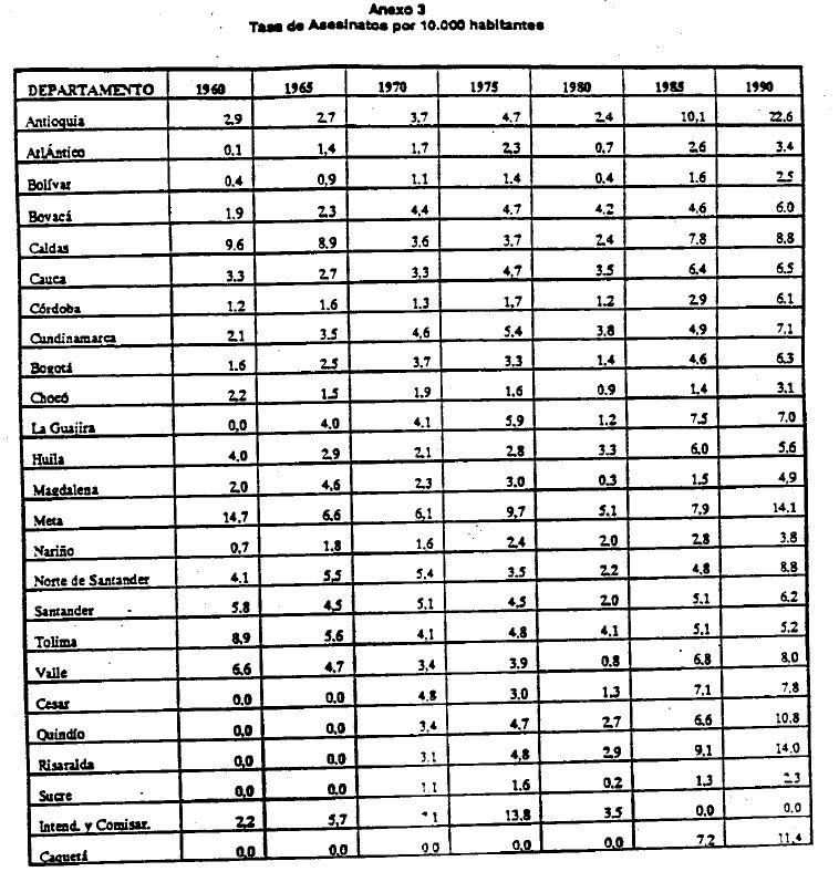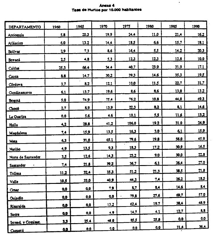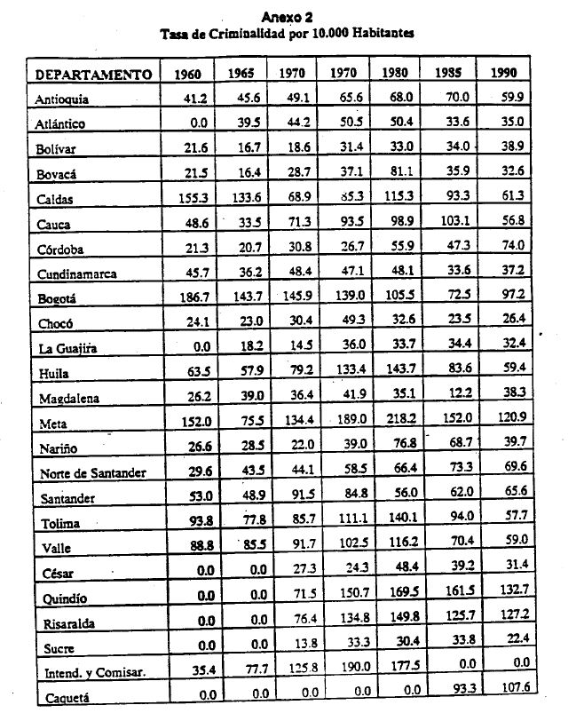 Colombia tiene una tasa de criminalidad excepcionalmente alta. Esta información se sostiene al menos para los últimos 20 años y se puede comprobar con las cifras sobre asesinatos en Colombia y en otros países. Mientras que en Colombia la tasa de homicidios fue de 77.5 por cada 100.000 habitantes en el período 1987-1992, en países como Brasil fue 24.6, Bahamas 22.7, México 20.6, Nicaragua 16.7, Venezuela 16.4, Argentina 12.4, Sri Lanka 12.2, Perú 11.5, Ecuador 11 y estados Unidos 8, en un período casi similar (1986-1989) (1), y para mencionar sólo a los más violentos. Más aún, a lo largo del pasado decenio se agravó notablemente el fenómeno en Colombia. Así, el número de homicidios pasó de 36 por cada 100.000 habitantes en 1981 a 48 en 1985 y a 80 en 1990 (2). La alta tasa de homicidios en Colombia no puede asociarse a una situación de guerra civil ni de violencia política, Aunque en Colombia ha subsistido por más de 40 años una actividad guerrillera, el número anual promedio de muertos en acciones militares pertenecientes a las fuerzas armadas regulares o a las guerrilleras en una proporción casi insignificante del número total de homicidios de los últimos decenios (menos del 1% en 1993). Más aún, l as actividades de la guerrilla ligadas al narcotráfico y al secuestro de civiles con fines económicos hacen cada vez más borrosa la línea divisoria entre la violencia política y la criminalidad. En Colombia violencia y criminalidad son casi sinónimas en su historia contemporánea y sobretodo en los últimos años. La explicación de los factores que inciden sobre la criminalidad en Colombia tiene, por tanto, gran importancia en la actualidad. En efecto, de un diagnóstico correcto de los problemas de inseguridad y criminalidad pueden resultar las políticas correctivas, tan necesarias en un ambiente de impunidad y pesimismo.A fin de comprender menor la hipótesis y los resultados de este trabajo es conveniente recapitular, en forma breve, los temas y las ideas dominantes al res