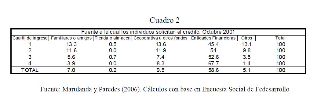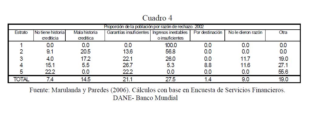 This paper identifies the main determinants of credit access for Colombian households. It finds that income, wealth, geographical position, access to social security, the education level and age affect the probability of credit use (mortgage loans and cre