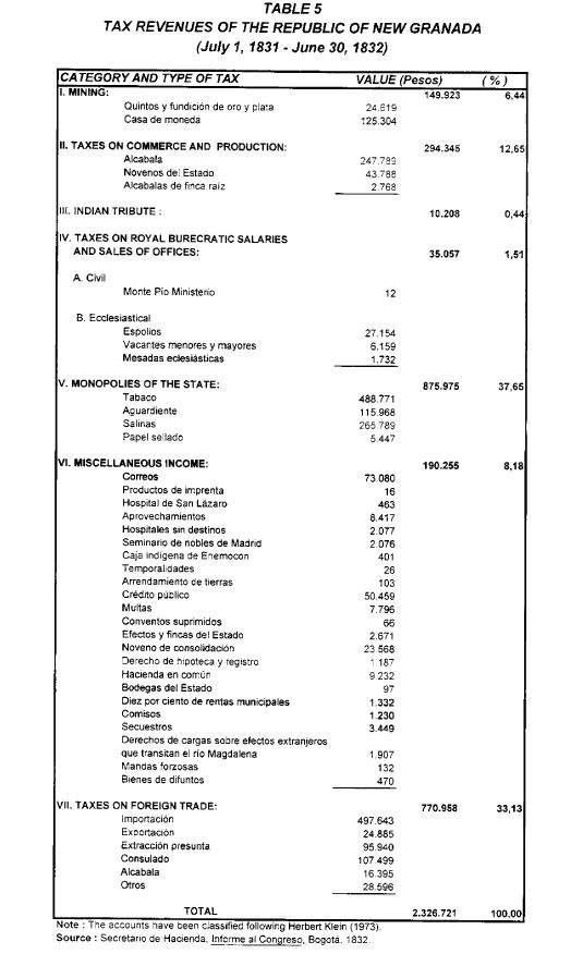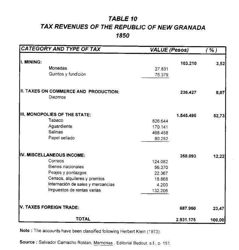 In this paper we study the estructure of the fiscal system of the Viceroyalty of New Granada towards the end of the colonial period. Then we discuss how the tax system inhereted from the Spanish Empire evolved over the period 1821-1850. The conclusion that emerges from the review of the evidence is that the new republic was succesful in improving the tax regime it had received from Spain. By 1850, the Republic of New Granada possesed a fiscal system that was much more fair, efficient and neutral, than was the case in 1810.