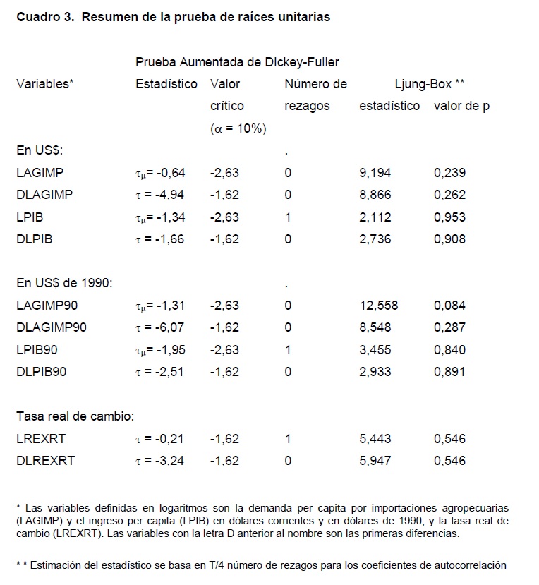 Durante la década de los noventa las importaciones agropecuarias en Colombia se han incrementado considerablemente contribuyendo al déficit de la cuenta corriente, lo cual ha causado preocupación. Este incremento de las importaciones agropecuarias se ha atribuido a la apertura económica, al mismo tiempo que se le señala como la razón más importante detrás del comportamiento mediocre del sector agropecuario. No son pocos los que han sugerido echar atrás el proceso de liberación del comercio exterior, y aunque tal cambio de política es poco probable debido a los compromisos internacionales adquiridos, es evidente que dicho proceso se ha desacelerado en los últimos tres años. Este estudio examina algunos efectos del proceso de apertura internacional en el sector agropecuario, evaluando las relaciones entre las importaciones agropecuarias y variables macroeconómicas como la tasa real de cambio y el ingreso, al tiempo que verifica la hipótesis de un cambio estructural en la demanda de importaciones agropecuarias como resultado de la apertura del comercio internacional en 1991. Para lograr este objetivo se desarrolla un modelo econométrico y se evalúan las relaciones de largo plazo entre las variables por medio de cointegración. Los resultados indican que el incremento de las importaciones agropecuarias se explica principalmente por la revaluación de la tasa real de cambio y el aumento del ingreso per capita de los consumidores, en tanto que las políticas de apertura han contribuido al desplazamiento de la demanda por importaciones agropecuarias aunque en una magnitud menor a la que comúnmente se le ha atribuido.