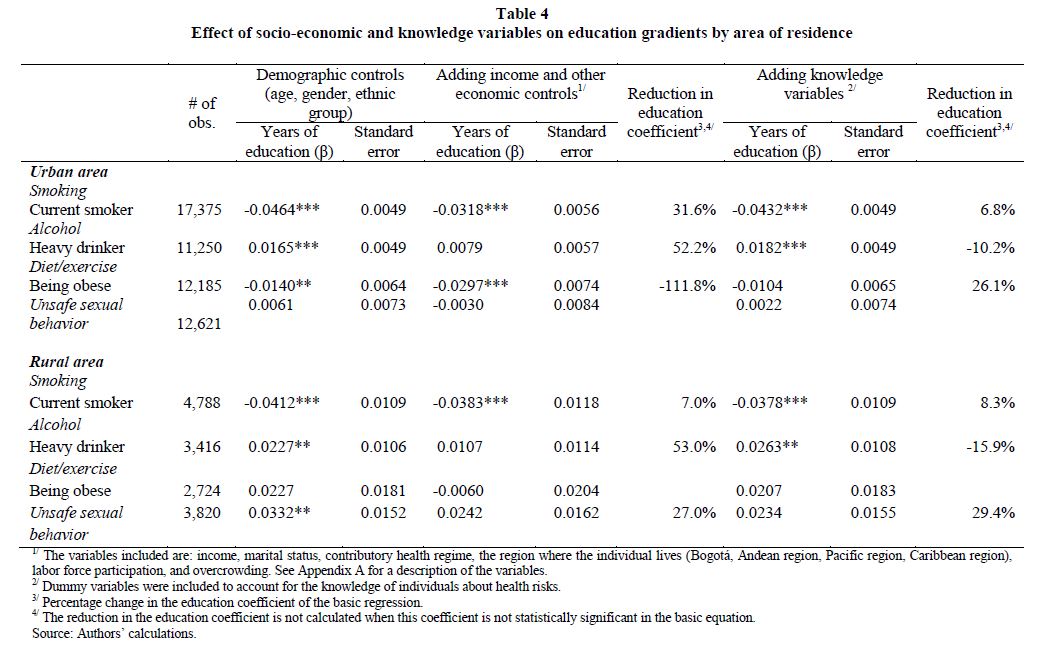 | dc.description.abstract | This paper uses the Colombian National Health Survey to analyze the relationship between education and risky health behaviors, namely smoking, heavy drinking, being obese, and unsafe sexual behavior, by estimating the education gradient using Logit models | eng |