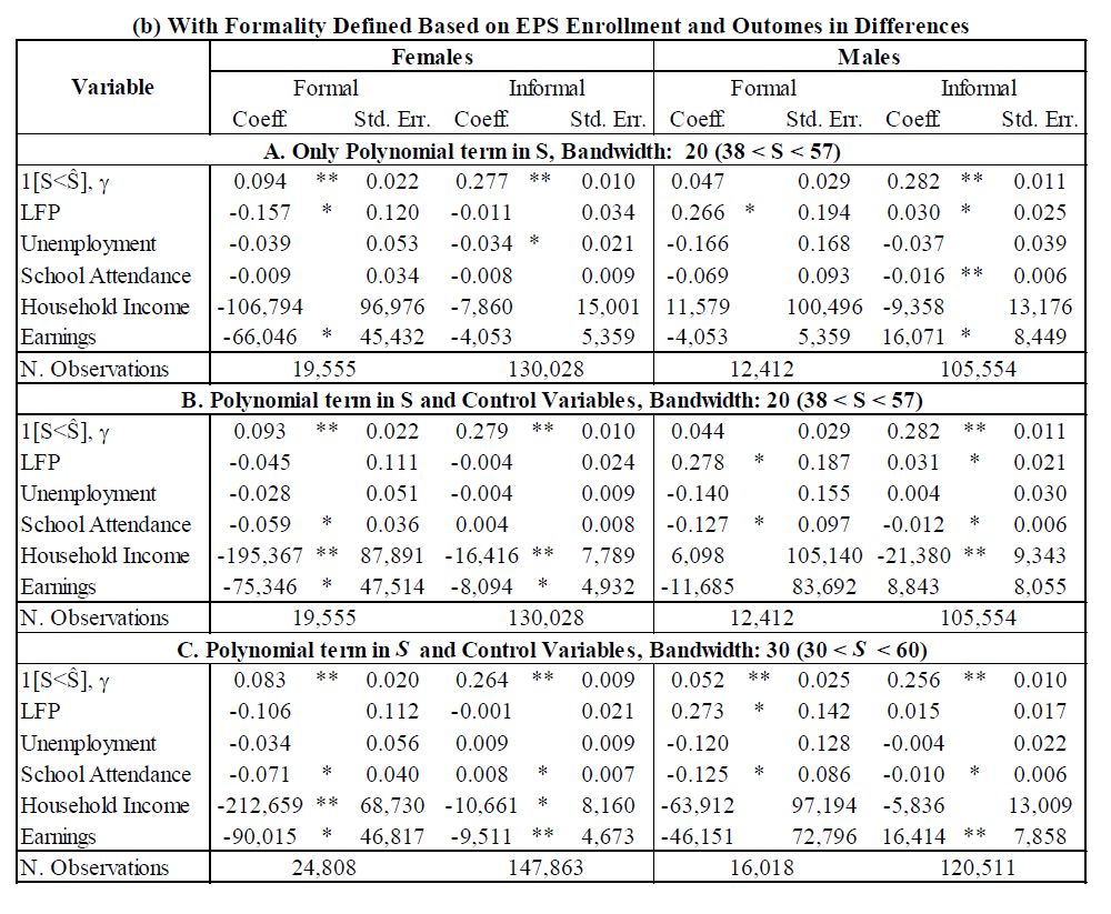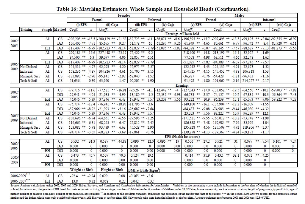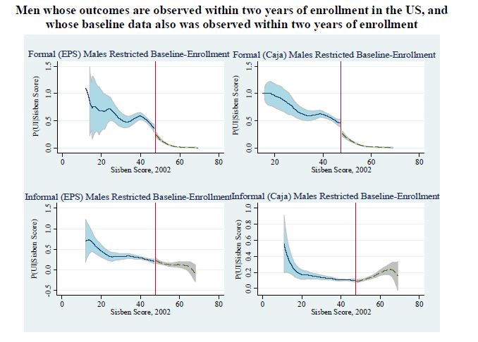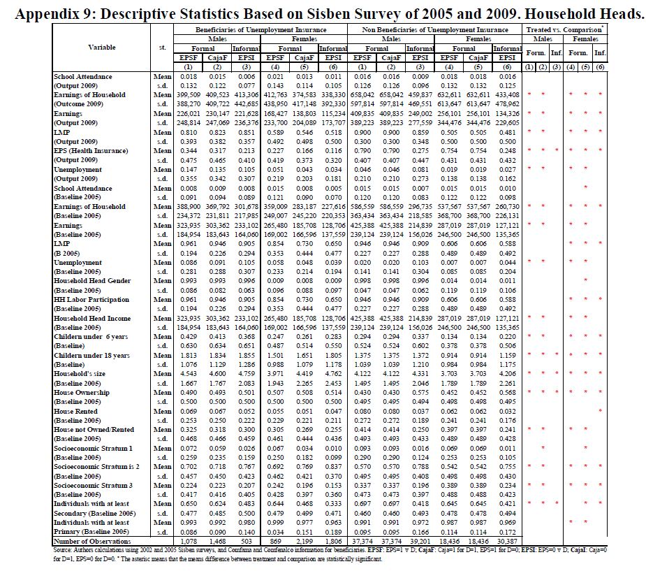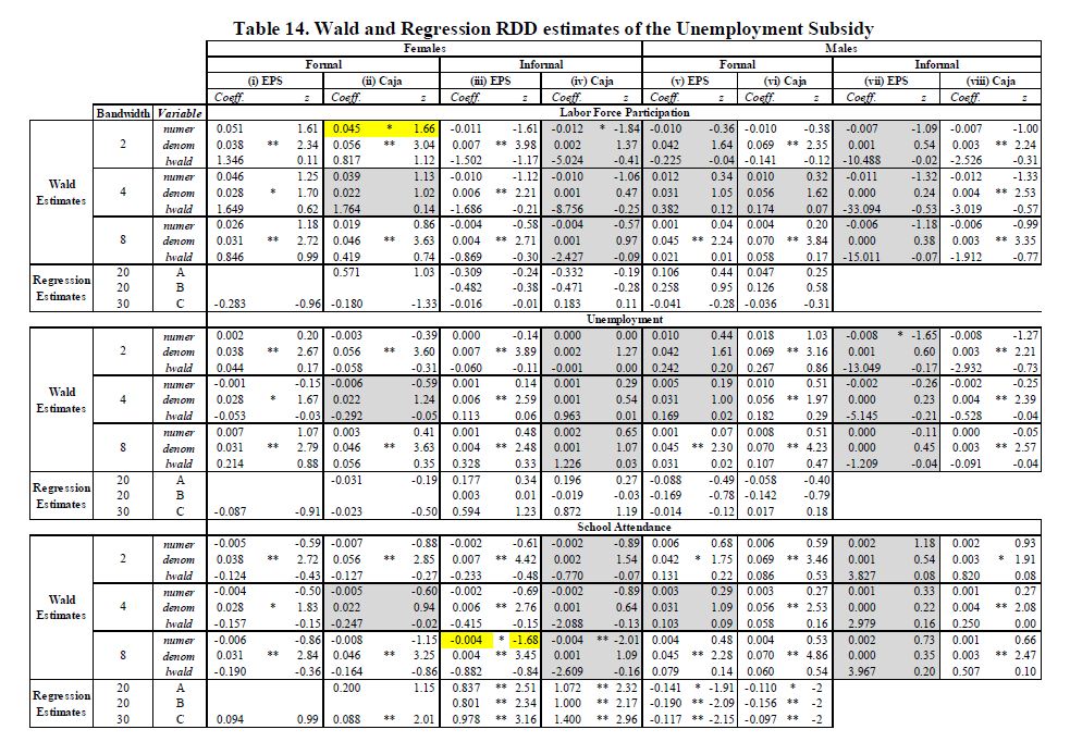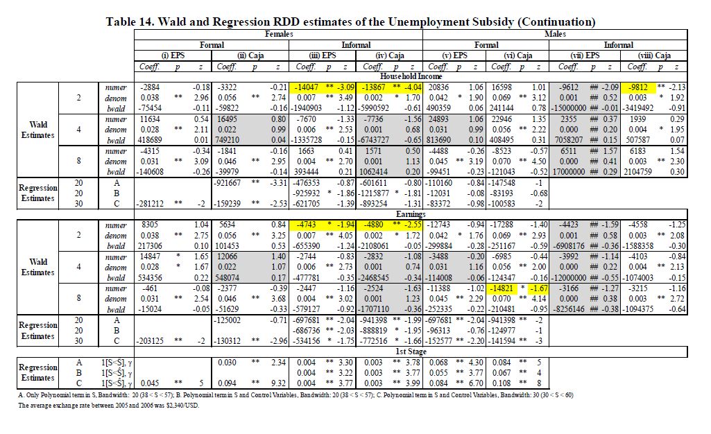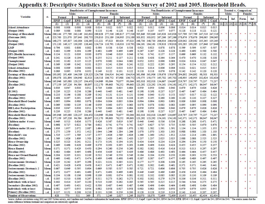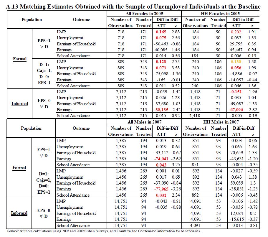 Se estiman los efectos del subsidio al desempleo colombiano (US) en la participación laboral, desempleo, formalidad, asistencia escolar e ingresos de sus beneficiarios, en los ingresos y la asistencia escolar de los miembros del hogar, y en el peso y la talla de los niños al nacer. El programa les transfiere efectivo a sus beneficiarios, y les provee formación para el trabajo. Resultados basados en estimadores de regresión discontinua y pareo de diferencias en diferencias, indican que la participación en el mercado laboral, los ingresos de los beneficiarios, y el ingreso del hogar, no se incrementan, y para algunas poblaciones se reducen, durante los 18 meses transcurridos después de salir del programa. El aseguramiento privado en salud se reduce. Los hombres jefes de hogar registran 05res reducciones en sus ingresos y en su participación laboral, y 05res crecimientos en tasas de desempleo. También se encuentra un efecto positivo, pequeño pero significativo, en la asistencia escolar de los beneficiarios, pero no en el peso o la talla de sus hijos al nacer. Los resultados son sensibles al tipo de formación para el trabajo que los beneficiarios reciben en el programa. En conjunto, el programa ha servido más como un mecanismo para suavizar el consumo y proveer asistencia social, que como un mecanismo para promover un mercado laboral más eficiente.