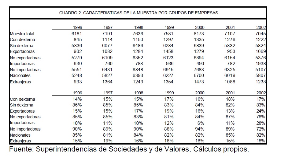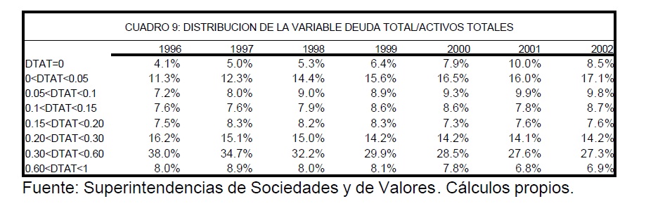 Este estudio profundiza sobre la forma como las empresas colombianas fueron afectadas y respondieron a la crisis de finales de la década pasada en términos de su estructura de financiamiento. Para ello, se ha adoptado una metodología que se caracteriza por tres elementos: (i) tiene como eje del análisis de las finanzas de las empresas colombianas entre 1996 y 2002 la evolución de su estructura de capital; (ii) estudia esta evolución a la luz de teorías sobre los determinantes de dicha estructura y su relevancia para el país; (iii) se apoya en una estrategia de análisis empírico que permita identificar diferencias de comportamiento tanto entre empresas como en el tiempo.