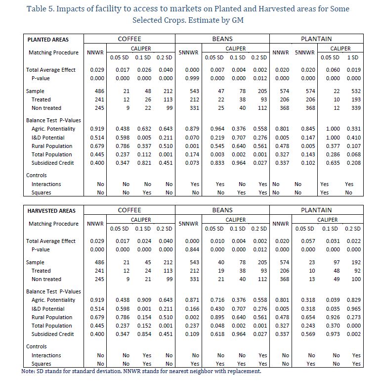 This paper evaluates the role of rural infrastructure on the performance of some agricultural crops in Colombia. The study utilizes geo-referenced cross sectional data of four crops, coffee, rice, beans and plantains, collected for the majority of municip