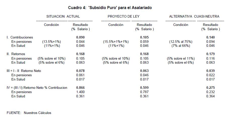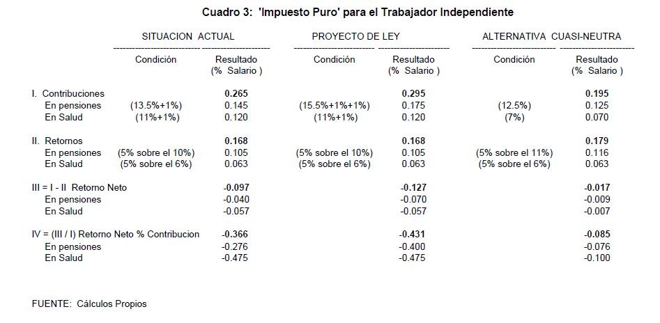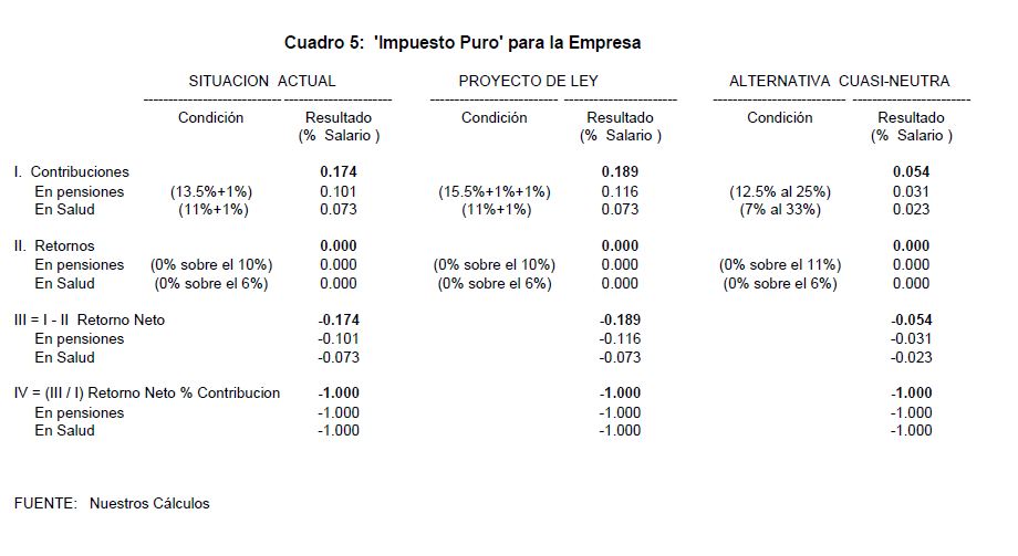 En este trabajo analizaremos el monto del llamado "impuesto puro" que se genera en las contribuciones destinadas a pensiones y salud en Colombia. Hemos calculado que este impuesto asciende en la actualidad a cerca del 17% para las empresas, por cada peso pagado a través de la nómina. Siendo que este monto es bastante elevado si se le compara con el cero o 3% observado en Chile, no parece conveniente elevar aun más las contribuciones a la seguridad social en cabeza de las empresas. Si dichas contribuciones en pensiones y salud se incrementan del actual 26,5% al 28,5% en los próximos tres años, como se propone en la reforma pensional, este impuesto alcanzaría cerca del 20% a partir del año 2005. ¿Qué empresa colombiana podrá competir en el ATPA, ALCA o CAN con sobre-costos parafiscales cercanos al 40% (incluyendo los diferentes a la seguridad social) e "impuestos puros” del 20%" ¿Cuál será la dinámica del desempleo y la informalidad laboral en los próximos años si recargamos los costos de la producción formal?