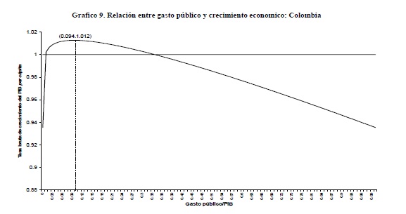 En este documento se presentan los resultados de la estimación econométrica del modelo de gasto público y crecimiento económico de Barro (1990). La estimación fue de tipo panel utilizando datos de frecuencia anual de 83 países (con poblaciones 05res a 2 millones en 1980) a lo largo del período 1982-1999. Cuando se juzgan los crecimientos del gasto público y del producto tanto de Colombia como de otros países de ingreso medio a la luz de las estimaciones del modelo surge una conclusión: el gasto público colombiano se volvió excesivo durante la segunda mitad de los años 90 y, por tanto, contribuyó a la reducción de la tasa de crecimiento de la economía.