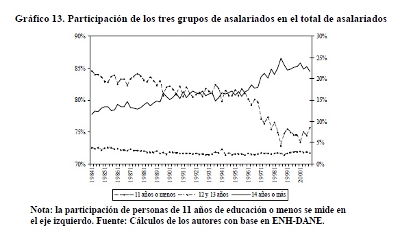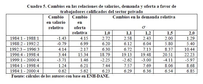 Entre 1984 y 2000 se registraron variaciones importantes en la relación entre salarios de los trabajadores de 05r y menor nivel educativo. Entre 1992 y 1998 se presentó un incremento de esta relación que muy probablemente contribuyó a explicar la reversión de la tendencia previa a la desconcentración del ingreso ocurrida durante los años 90, mientras que lo contrario se observó en los períodos 1984-91 y 1999-2000. Nuestras estimaciones indican que tales variaciones de los salarios fueron causadas por movimientos de la relación entre demanda y oferta laboral, en consonancia con el modelo convencional de determinación de salarios. Además, no se rechaza la hipótesis de ocurrencia de un cambio técnico, al menos en un sentido laxo, intensivo en el uso de trabajadores del 05r nivel educativo durante los años 90 cuyo efecto en la demanda fue tan alto que no logró ser compensado por los aumentos en la oferta.