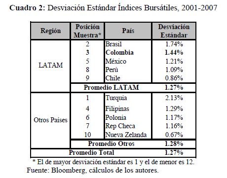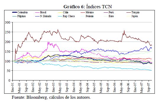 Teniendo en cuenta que la volatilidad de la tasa de cambio puede afectar en gran medida al sector real y financiero, se hace un estudio comparativo entre Colombia y once países seleccionados, algunos por su similitud con Colombia en algunos aspectos y otros porque sus monedas son una referencia obligada (Euro y Yen). Se analiza la caracterización de la dinámica cíclica de la volatilidad, su persistencia y sus determinantes. Se encuentra que la volatilidad de Colombia es una de las menores (octava de un total de doce), aunque es la segunda más persistente. Adicionalmente, se encuentra que en Colombia la volatilidad es 05r en períodos de devaluación que en los de revaluación. Se observa que el ciclo de la tasa de cambio en Colombia está caracterizado por ser de 05r amplitud que en otros países y con un período superior, lo que sugiere 05r persistencia en términos de nivel. Desde el punto de vista de sus determinantes se puede concluir que aumentos en el EMBI (riesgo país) generan incrementos de volatilidad, mientras que los límites a la posición propia de contado (PPC) reducen dicha volatilidad.