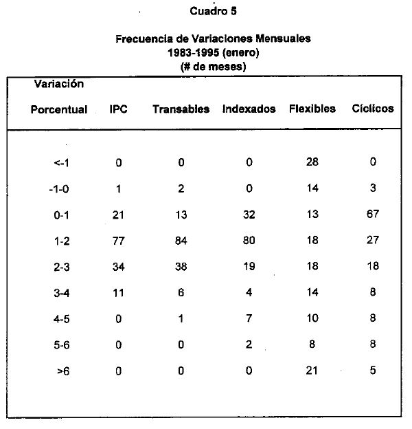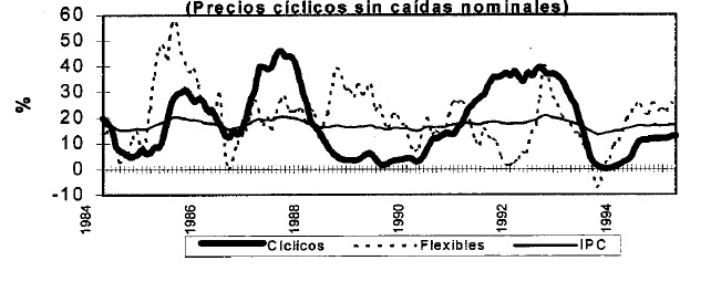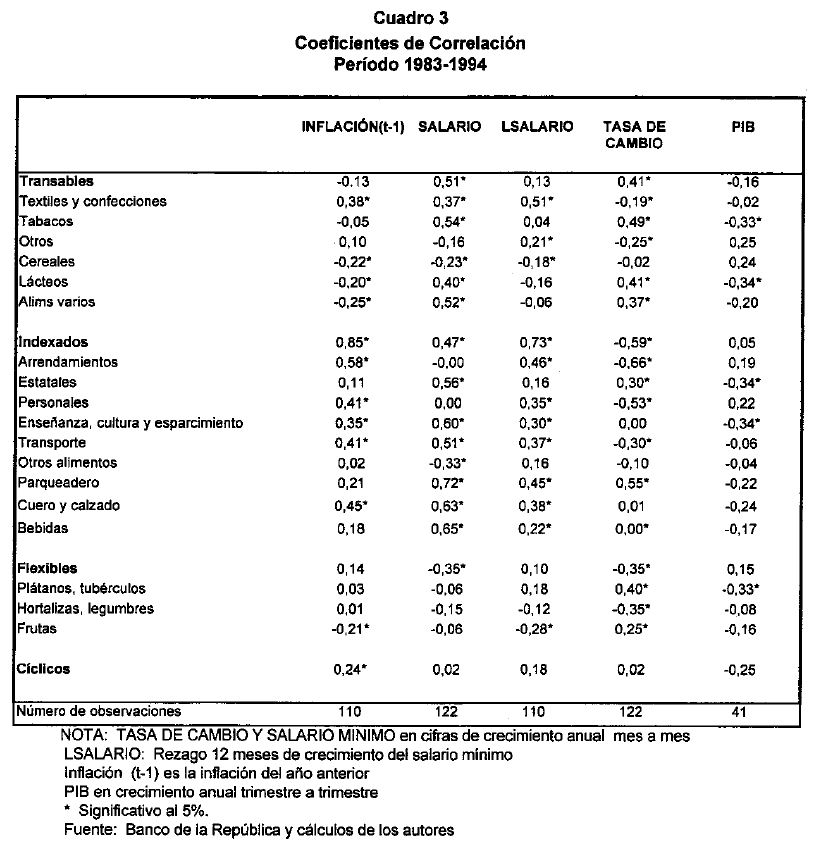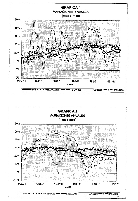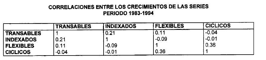 La ausencia de una clasificación apropiada ha conducido a innumerables desagregaciones del IPC, las cuales responden en buena parte a las preferencias de cada autor. Dentro de las desagregaciones más frecuentes, se encuentra aquella que separa a los alimentos de los no-alimentos. Los proponentes de esta desagregación la justifican con base en la particular volatilidad característica de los bienes agrícolas (véase, por ejemplo, Correa y Escobar, 1990; Villar, 1988; Fedesarrollo, 1988). Algunos autores han intentado dividir el IPC en sus componentes transables y no transables, en consonancia con una de las prácticas con mayor aceptación en la literatura internacional(2). Sin embargo, como se espera demostrar en este estudio, para el caso colombiano, esta clasificación no es tan útil, ya que por lo menos uno de estos grupos incluye precios de comportamiento muy heterogéneo.