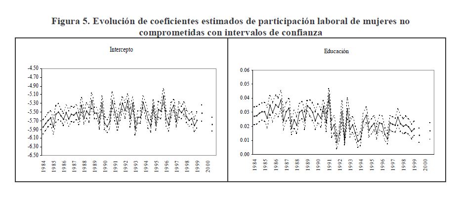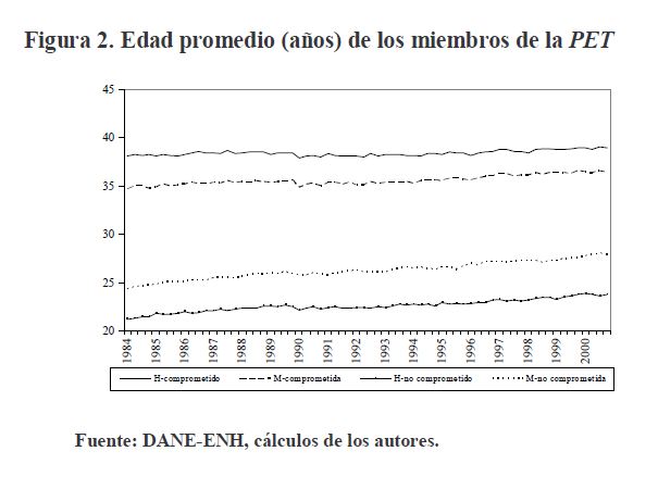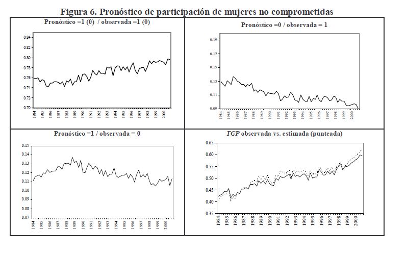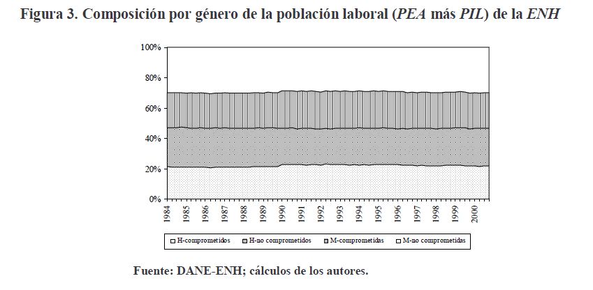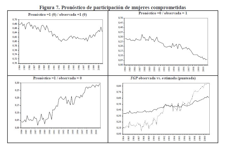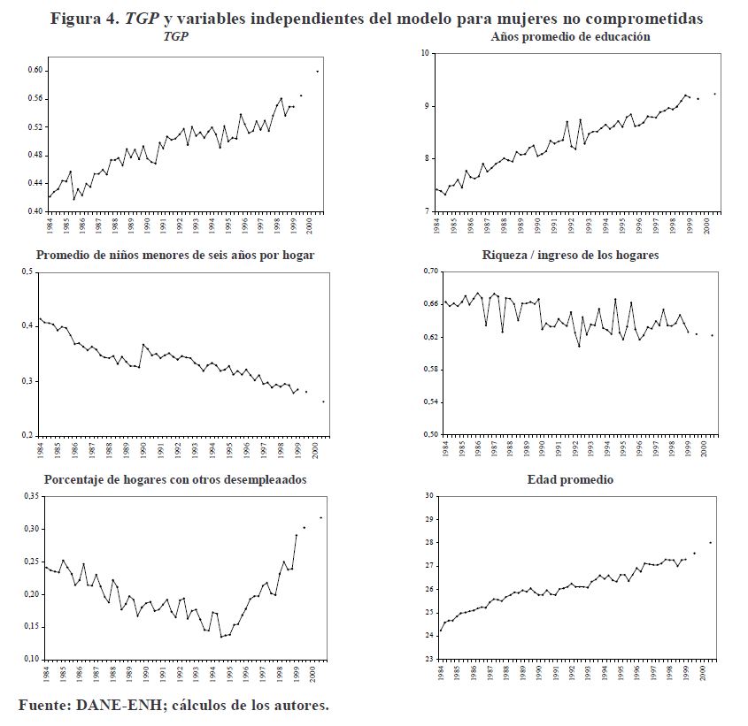 La oferta laboral está determinada por la decisión de participar en el mercado laboral. Este documento reporta los resultados de la estimación econométrica de un modelo de la tasa de participación (siete ciudades) para cuatro categorías de miembros del hogar: mujeres comprometidas (casadas o en unión permanente), mujeres no comprometidas (solteras, viudas o separadas), hombres comprometidos y hombres comprometidos, con base la Encuesta Nacional de Hogares (ENH) del DANE para el período 1984:1-2000:4. Las diferencias entre estos grupos son significativas. Entre los principales determinantes de efecto positivo de la tasa de participación se destacan la tasa de desempleo de otros miembros del hogar, la edad y el nivel educativo alcanzado; el principal determinante de efecto negativo es la riqueza de los hogares. Según el modelo, la tasa de participación cae ante disminuciones en la tasa de desempleo.