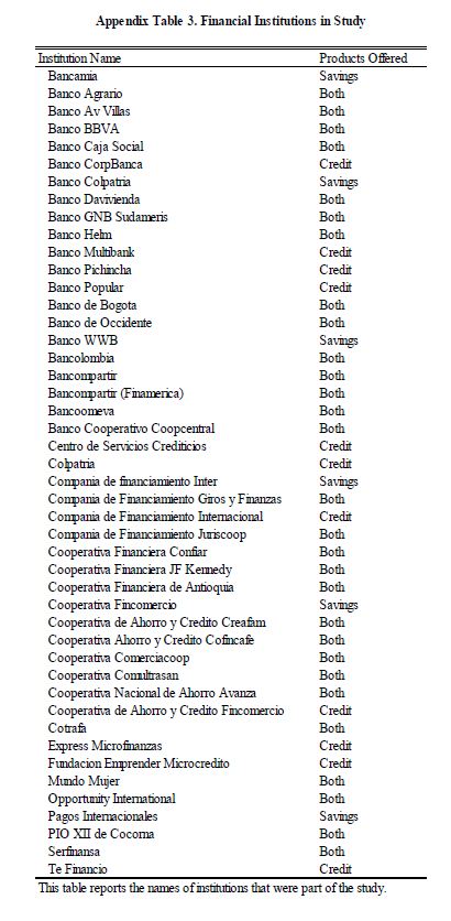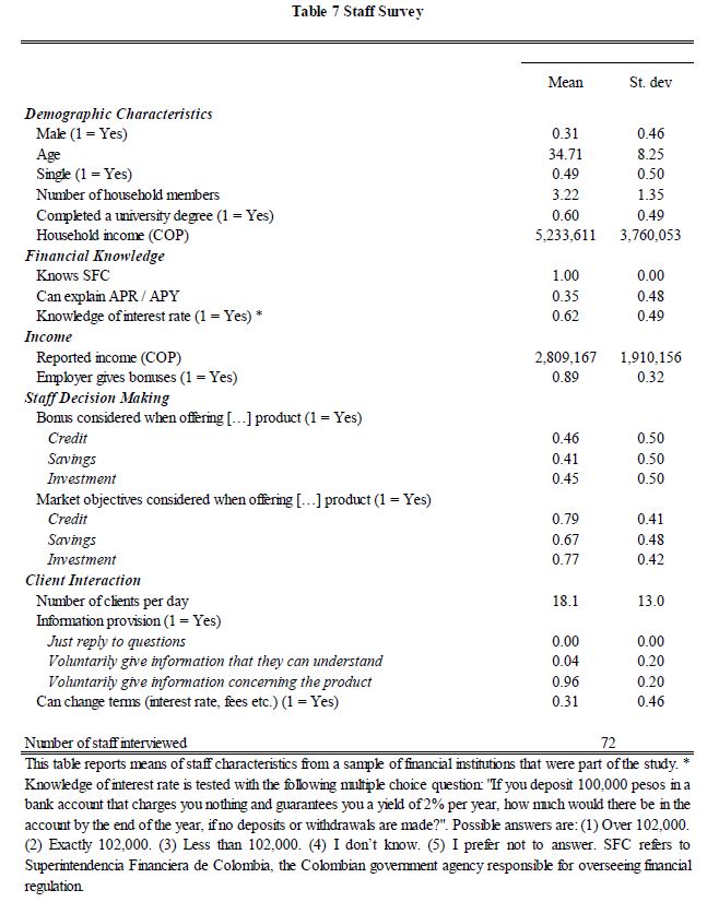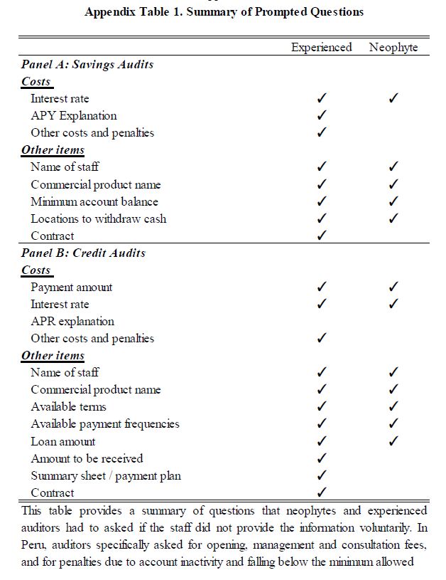 An audit study was conducted in Colombia following the protocols in Giné and Mazer (2017). Trained auditors visited multiple financial institutions, seeking credit and savings products. Consistent with Gabaix and Laibson (2006) and similar to Giné and Maz