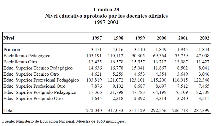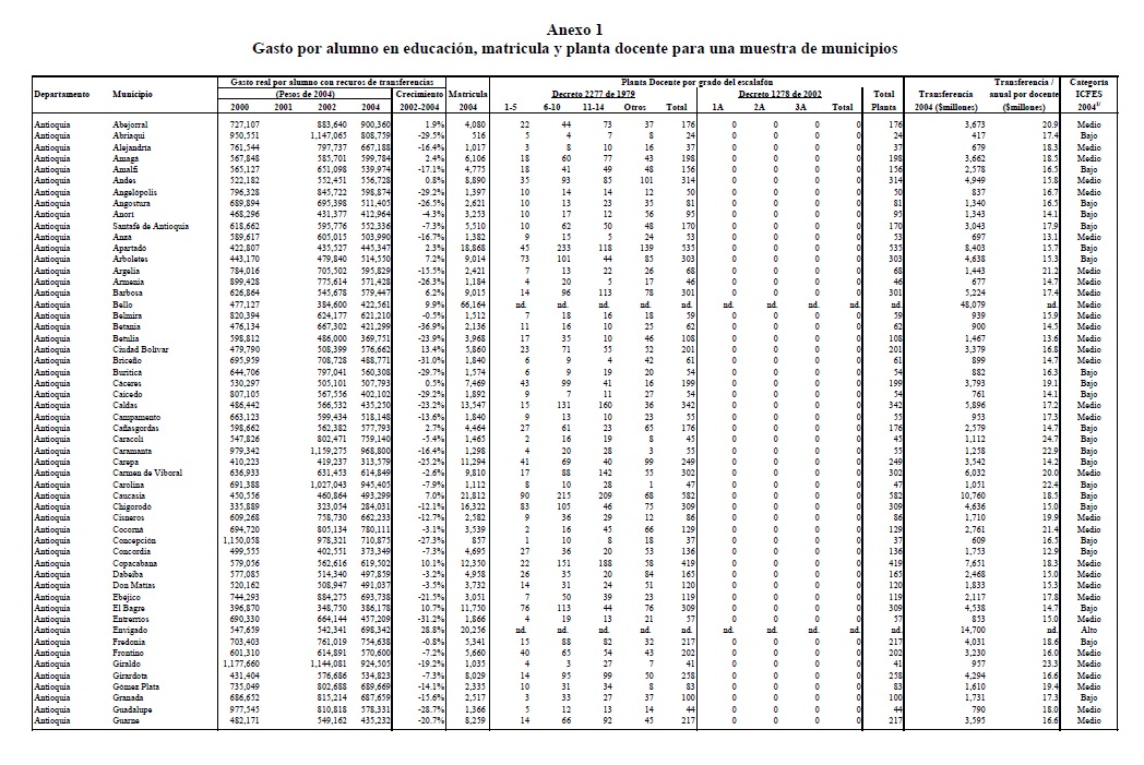 En este documento se presenta una visión amplia de los problemas y del funcionamiento del sector educativo en Colombia, con énfasis en la educación pública. Con este fin, en primer lugar, se realiza una evaluación detallada de las normas sobre descentralización educativa, así como de aquellas que rigen la carrera docente en el país; también se evalúa el comportamiento reciente de indicadores de gasto público, cobertura, eficiencia, calidad, se presentan algunas comparaciones internacionales y el esquema de remuneración e incentivos de los docentes. En segundo lugar, se mide el impacto sobre el rendimiento académico de factores asociados al colegio y al entorno socioeconómico de los estudiantes, y se estiman los niveles de eficiencia de una muestra de 4.542 colegios públicos y privados en el año 2002. Para este ejercicio se estima una función de producción del sistema educativo, utilizando técnicas de frontera estocástica. Los resultados indican que las variables asociadas a la infraestructura de los colegios y al entorno socioeconómico de los estudiantes, tienen un impacto positivo y significativo sobre el logro académico. En términos de eficiencia, los resultados muestran que los colegios privados se podrían estar beneficiando de condiciones de entorno más favorables, teniendo en cuenta que estos, en promedio, atienden alumnos de 05res ingresos. No obstante, cuando se asumen entornos equivalentes, no existen grandes diferencias en los niveles de eficiencia entre colegios públicos y privados.