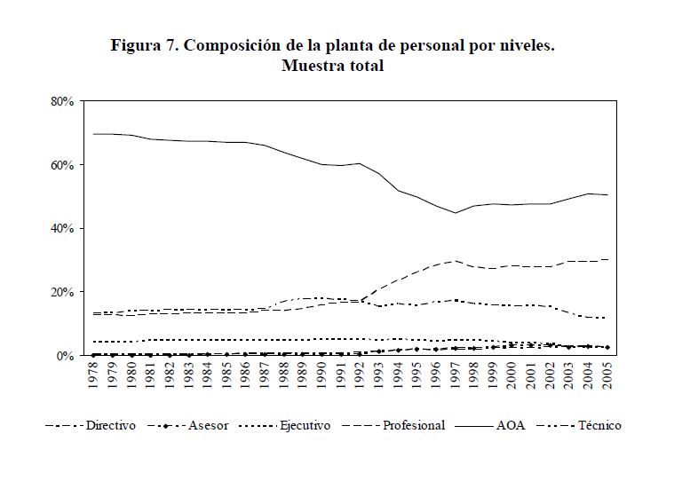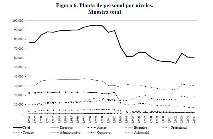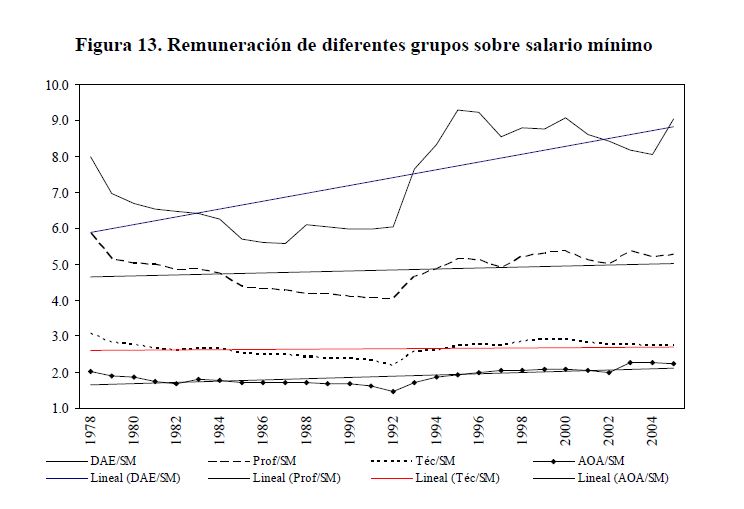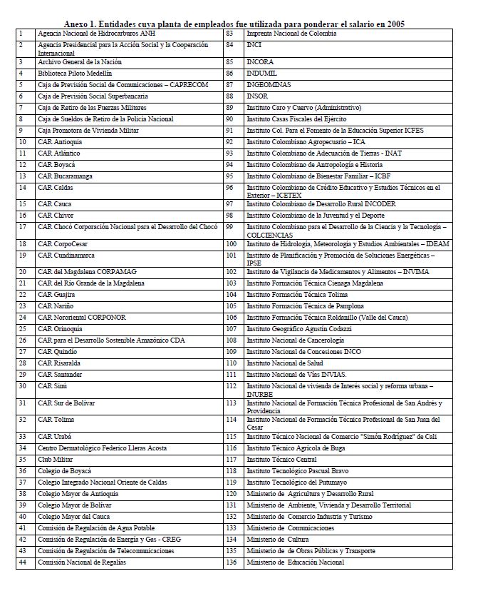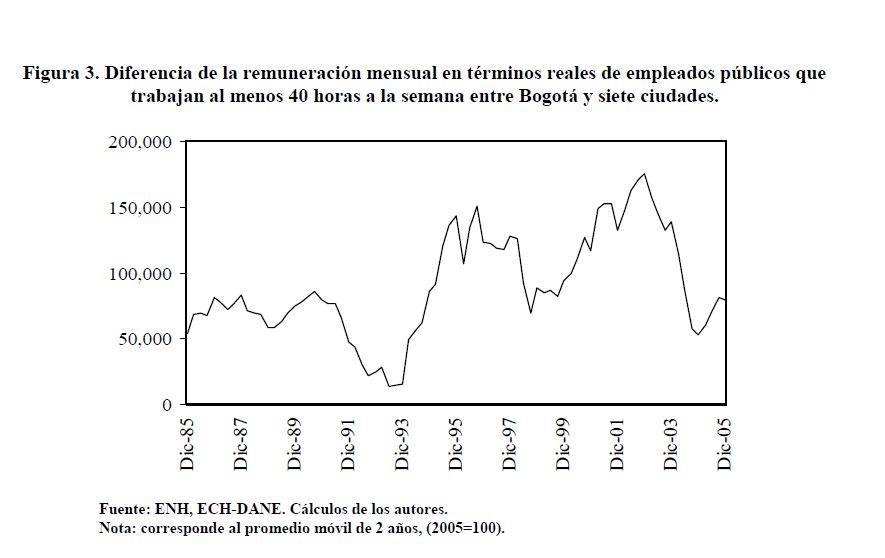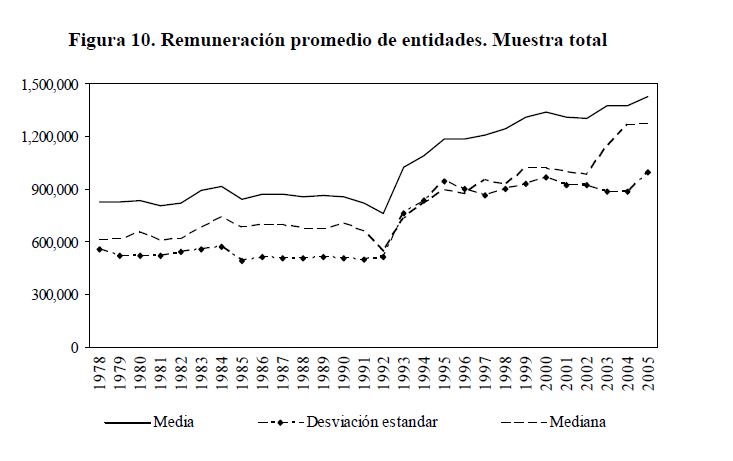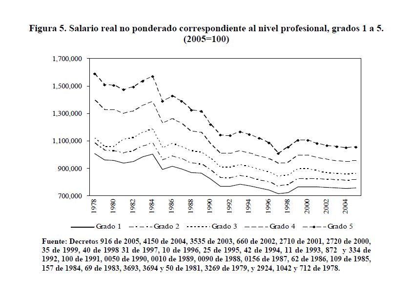 Utilizando la información de los decretos gubernamentales sobre plantas de personal y remuneraciones (salarios básicos y otros conceptos de la remuneración como son los pagos por gastos de representación, la prima de dirección, el subsidio de alimentación, etc.), se presenta una estimación del verdadero salario de los servidores públicos. Se hizo seguimiento a las plantas de cerca de 150 entidades por año entre 1978 y 2005. De acuerdo con la información obtenida, la remuneración media en el sector público fue $1.426.244 en 2005, a precios de ese año. Su trayectoria está asociada a la remuneración media de los niveles administrativo, operativo y asistencial, los cuales concentran el 05r número de plazas.
