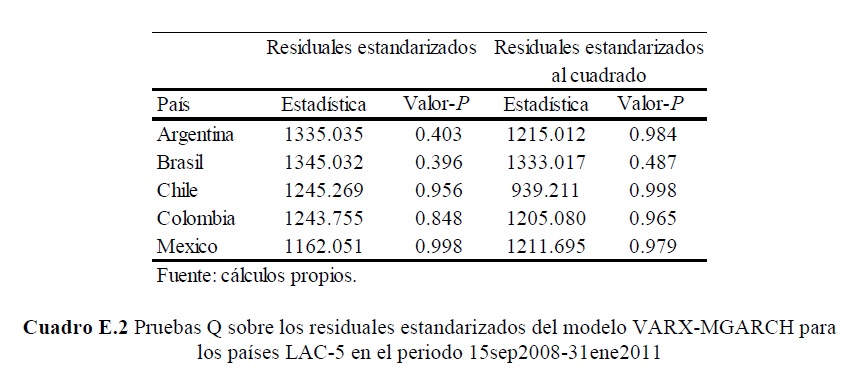 La crisis financiera internacional entre 2007 y 2009 causó grandes y a la vez bruscos movimientos de capitales entre economías avanzadas y emergentes, que fueron acompañados por cambios de similares características en los precios de los activos de éstas últimas, lo que se convirtió en un reto para las autoridades. El objetivo del documento es cuantificar y evaluar el grado de asociación entre los mercados financieros de las economías avanzadas y los precios de los activos de las economía más grandes de Latinoamérica, antes y después del anuncio de la quiebra de Lehman Brothers. Para cumplir con el objetivo se utiliza información diaria entre 2006 y 2011 y un análisis de multiplicadores a partir de un modelo de regresión VARX-GARCH. Los resultados muestran que los multiplicadores son significativos y relativamente pequeños; generalmente con los signos esperados, aunque heterogéneos para la muestra de países estudiados; de corta duración; imétricos; volátiles; y en muchos casos responden de manera opuesta antes y después de Lehman Brothers, lo que indicaría que en esta fecha se produjo un cambio estructural en los mercados internacionales de capitales.