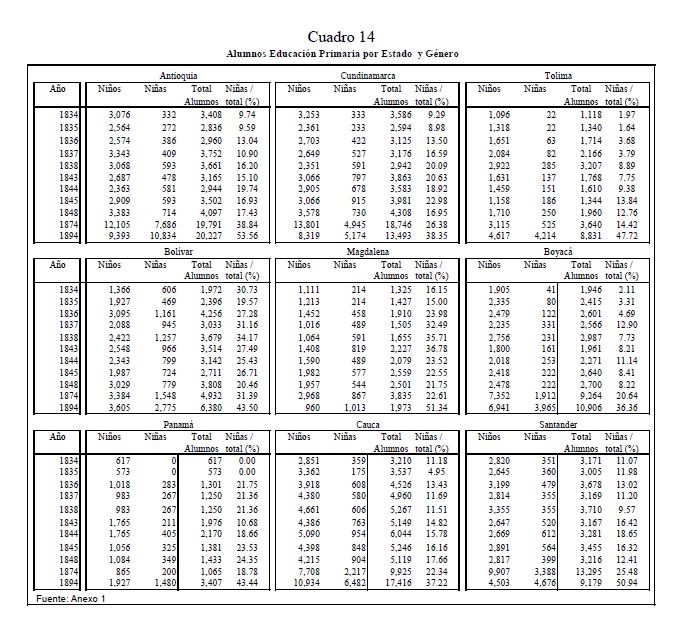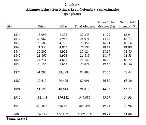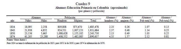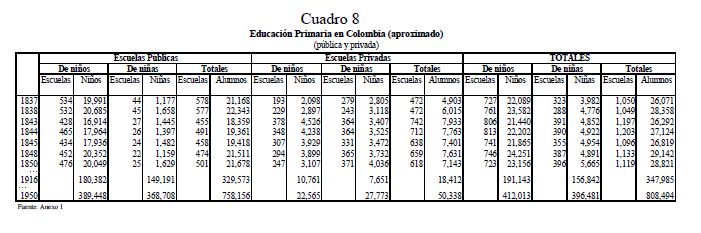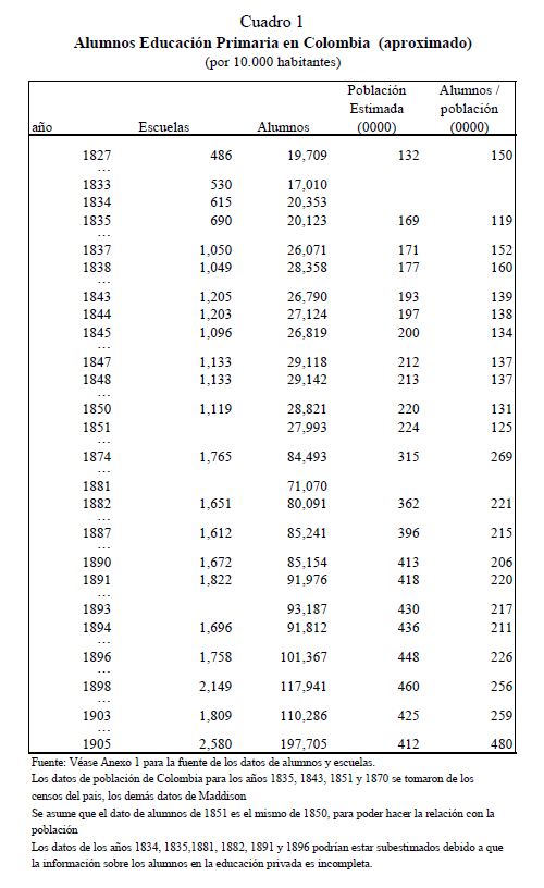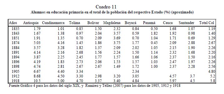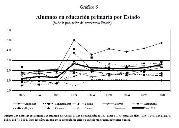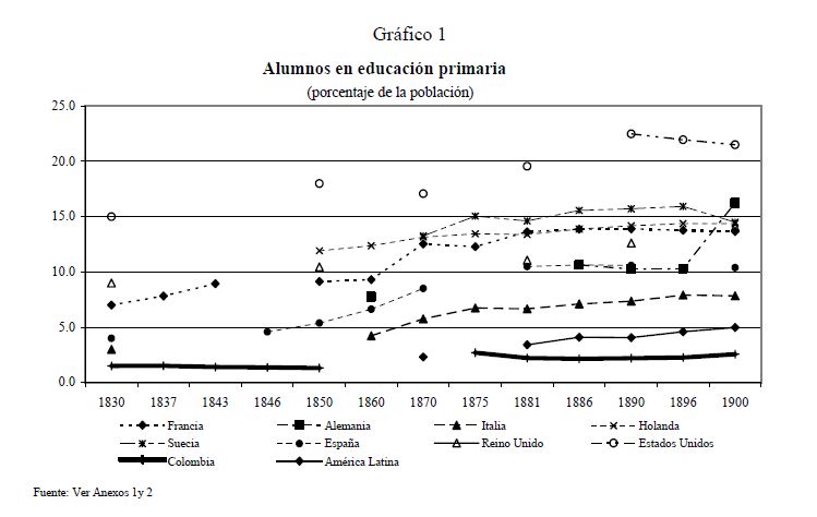 En este artículo se estudia la evolución de la educación primaria en Colombia durante el siglo diecinueve, y los factores que determinaron su desarrollo. Se exploran los posibles orígenes del fracaso y del lento progreso de la educación, los cuales llevaron a que Colombia a finales de ese siglo fuera uno de los países más atrasados del mundo en materia educativa. Se analiza también el comportamiento de la educación regional y cómo las disparidades entre los Estados tendieron a converger. Para estos propósitos, se ensamblaron y recopilaron series de frecuencia anual, tanto a nivel agregado como regional, sobre diferentes indicadores educativos cubriendo el 05r número de años posibles. Las principales razones, entre muchas, del fracaso en la masificación de la educación primaria en el siglo diecinueve en Colombia se pueden agrupar bajo el hecho que en Colombia no se presentó una estructura adecuada de incentivos que llevará a la expansión de la educación en el país dada la organización económica, política y social prevaleciente. Peor aún, a lo largo del siglo no se presentaron cambios en esta estructura de incentivos.