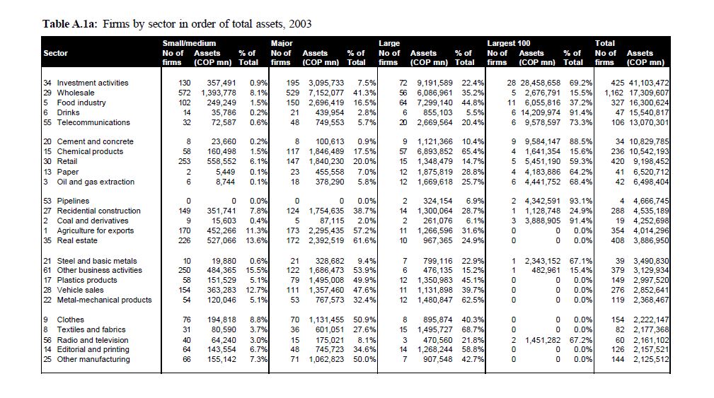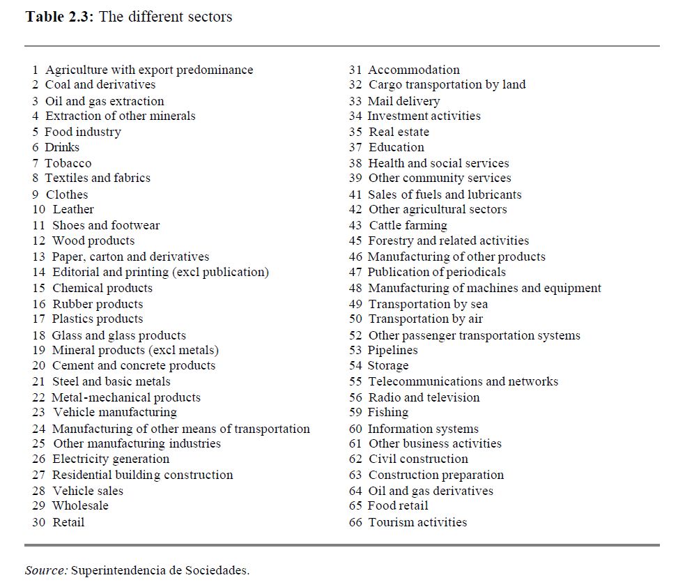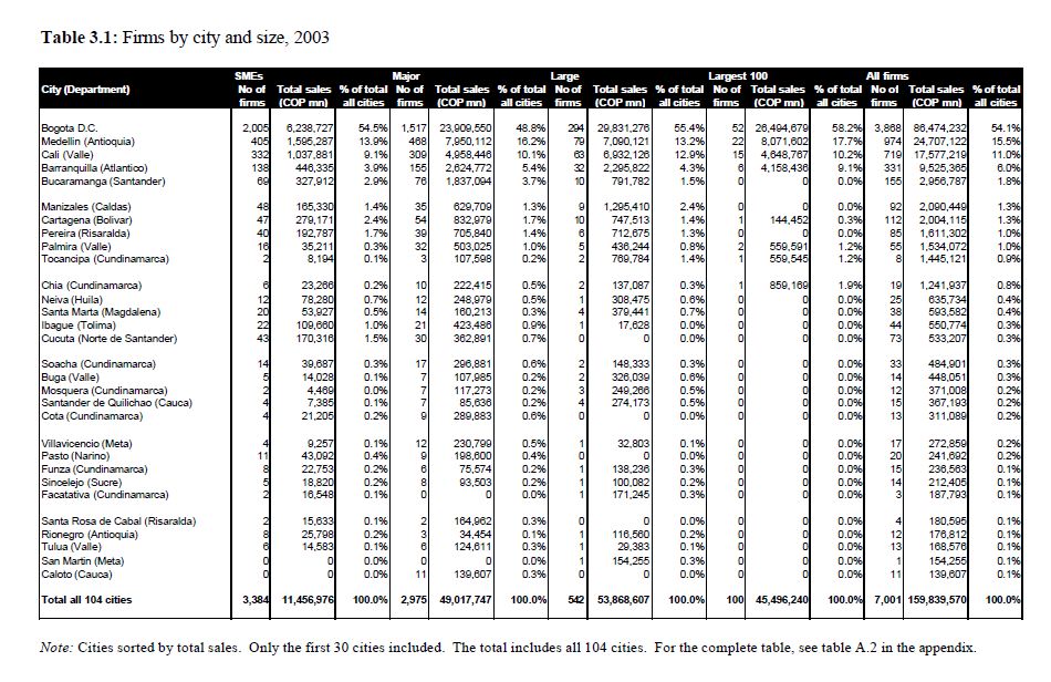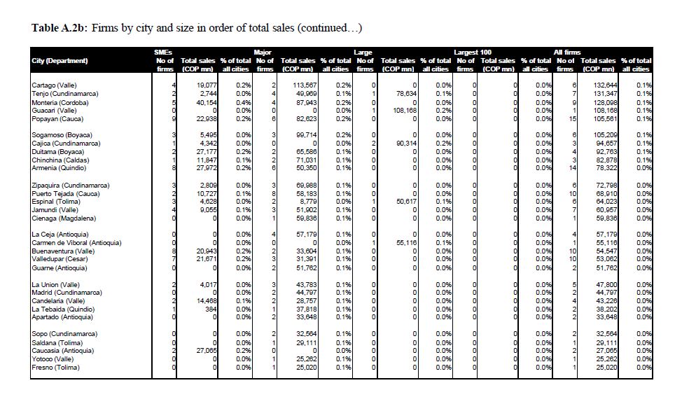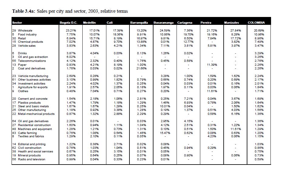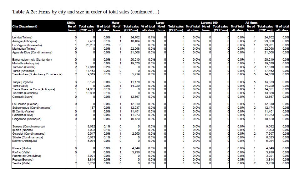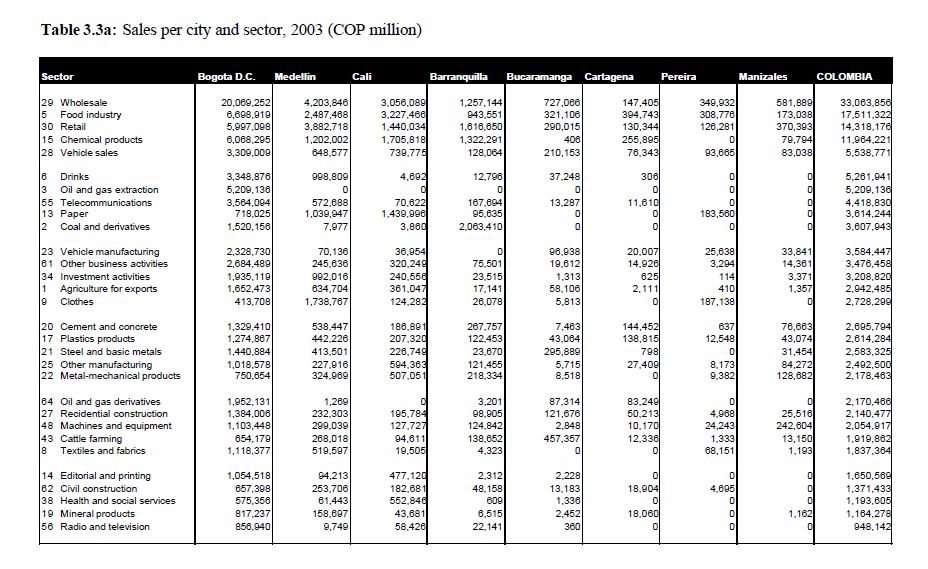 The study presented here looks at the Colombian corporate sector broken down by city. In particular, it studies the eight main cities of the country. It is an initial study, maybe the first of its kind, and it aims to act as a foundation for future rese