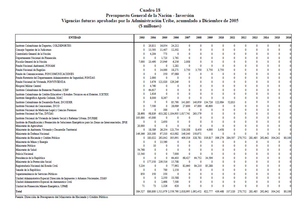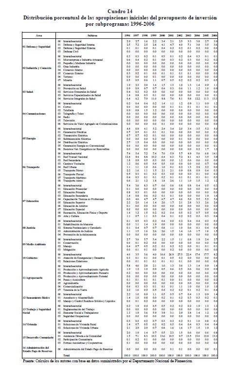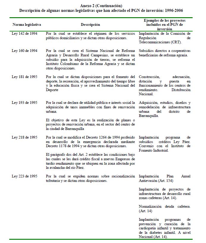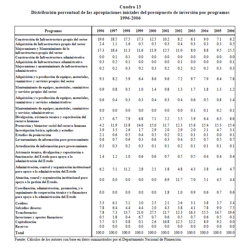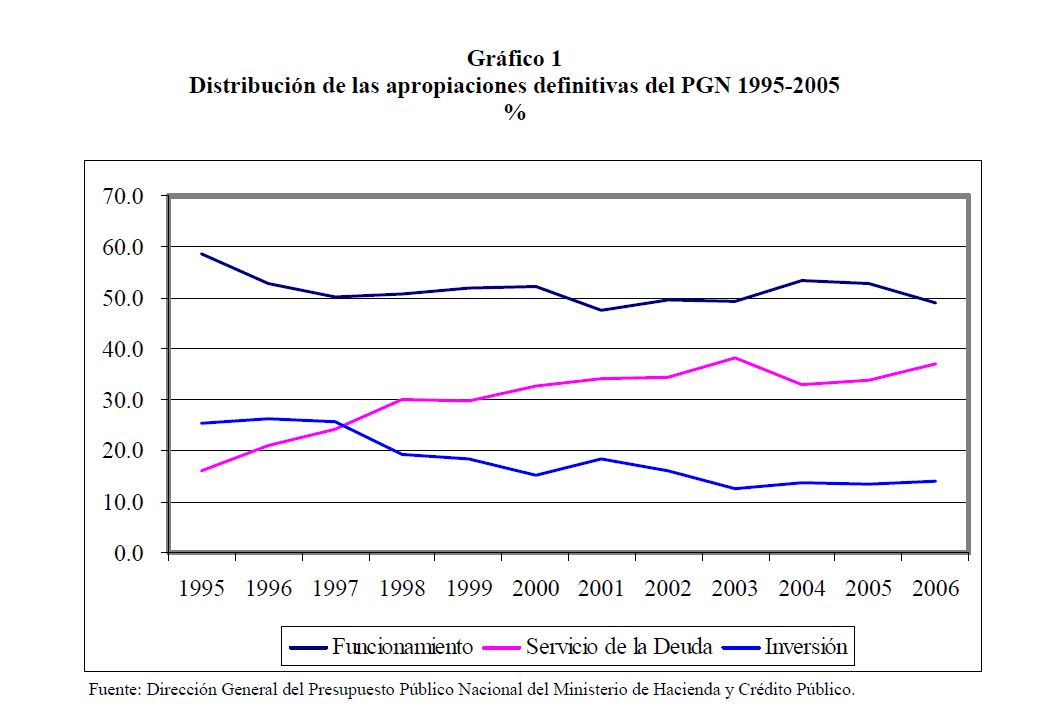 En este documento se presenta una descripción de las características y los aspectos más importantes del componente de inversión del Presupuesto General de la Nación. Se analiza el destino y distribución de los recursos, las interrelaciones entre el marco normativo y el proceso de programación presupuestal y el vínculo entre la política y la asignación de los recursos públicos. En términos generales el componente de inversión del PGN corresponde a una recopilación de proyectos de diferente naturaleza, de los cuales un porcentaje relativamente pequeño se asigna a infraestructura y adquisición de equipo. Este hecho contrasta con la definición de inversión de las cuentas nacionales que corresponde a formación bruta de capital fijo.