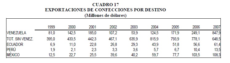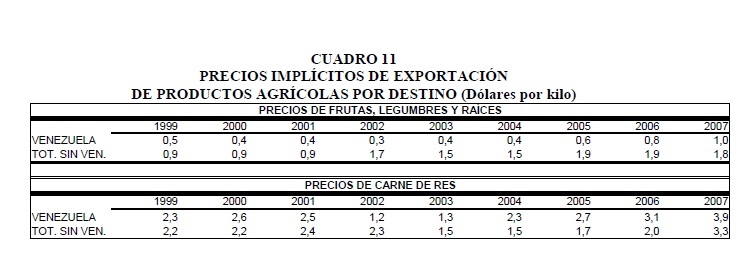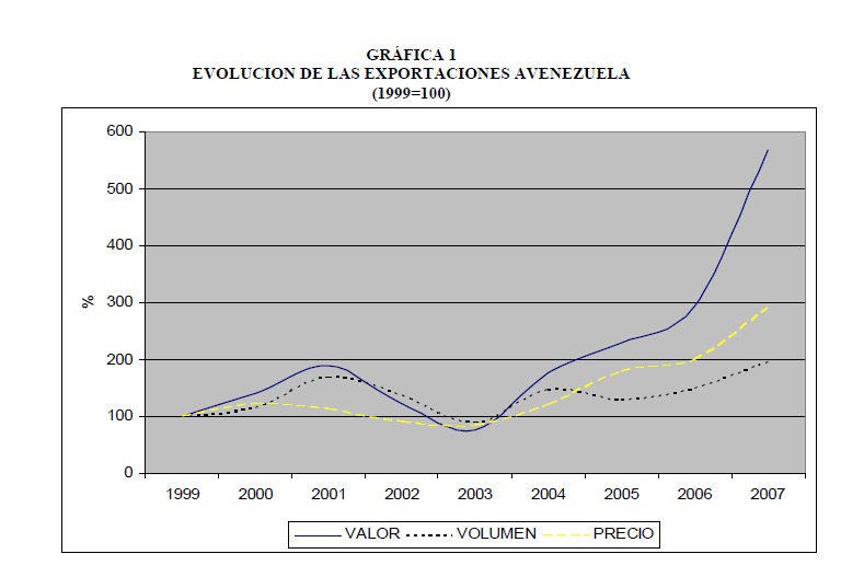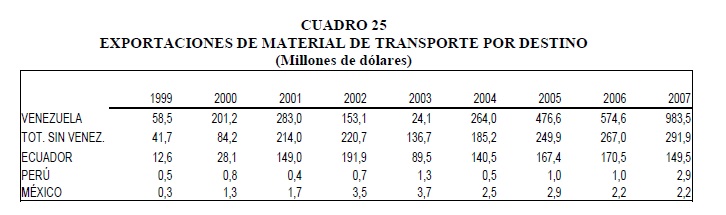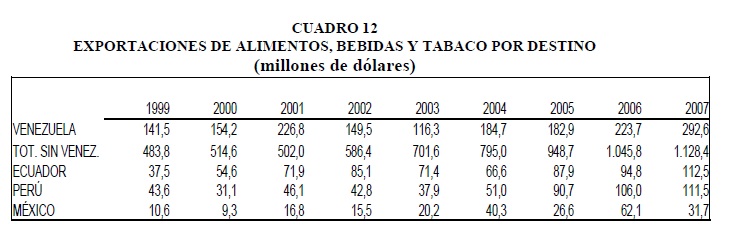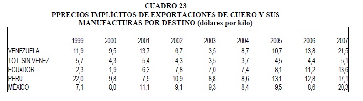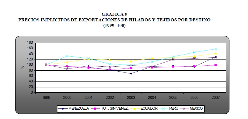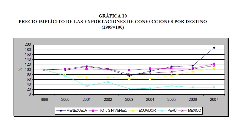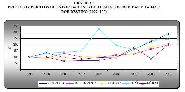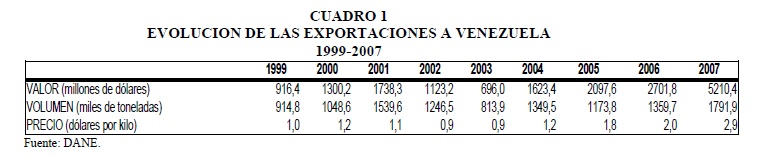 Valor y precio de las exportaciones colombianas a Venezuela entre 1999-2007 frente a tres países de referencia