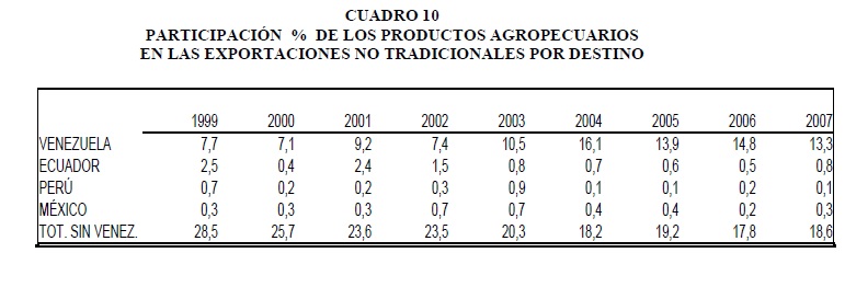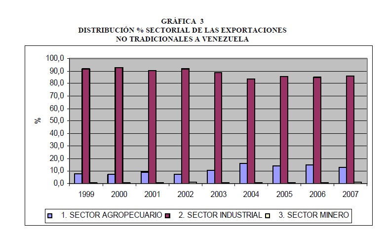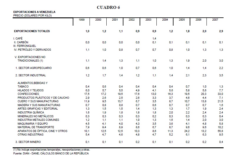 Las exportaciones colombianas hacia Venezuela han venido creciendo en forma notoria en el valor, y en menor grado en el volumen. En este documento se analiza el comportamiento de los precios implícitos (precios) de las exportaciones colombianas hacia Venezuela, principalmente; y comparada su evolución con los precios pagados por Ecuador, Perú, México y Estados Unidos. Tal análisis comprende los años entre 1999 y 2007, período que comprende años anteriores y posteriores a la crisis económica y laboral en Venezuela. Hacia el mercado venezolano se dirige básicamente el rubro de productos ?no tradicionales?, que para el año 2007 se convirtió en el principal comprador debido a los menores despachos de productos colombianos hacia los Estados Unidos. El 05r crecimiento del valor exportado frente al del volumen despachado no se concentra exclusivamente en Venezuela. También este fenómeno se presentó en las exportaciones hacia mercados como el mexicano, peruano y el de los Estados Unidos. En general hacia estos países, los valores exportados aumentaron más que sus cantidades enviadas, especialmente en productos tales como, material de transporte, confecciones, textiles y productos agropecuarios.