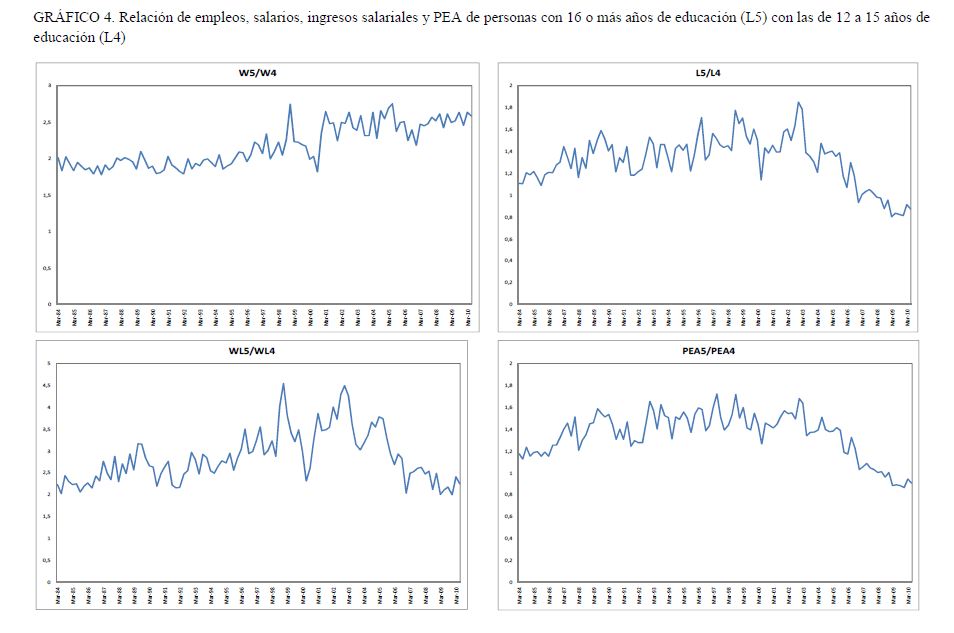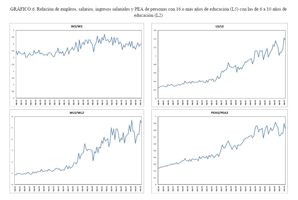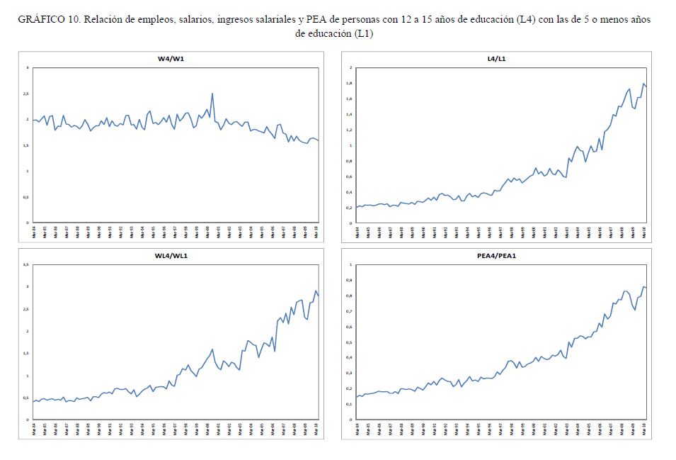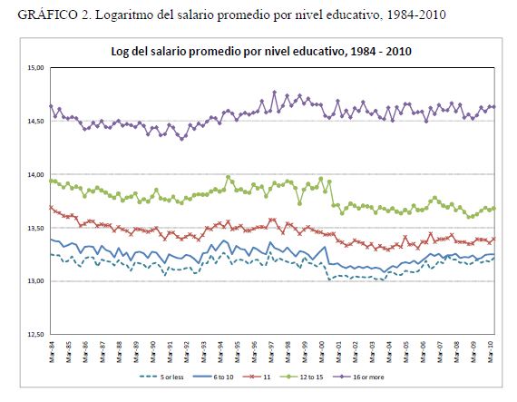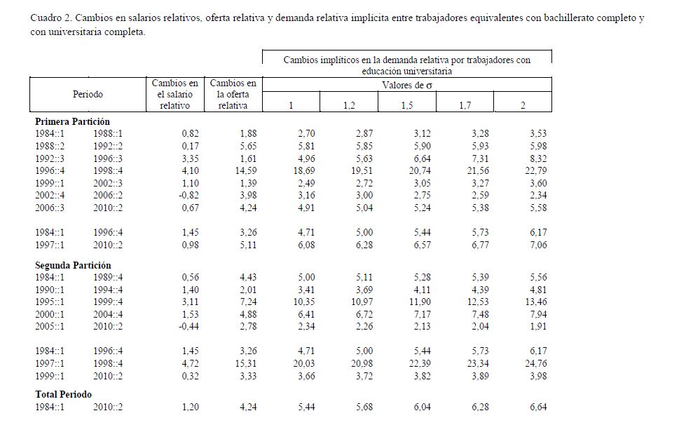 La evidencia muestra que la oferta y el precio del trabajo calificado relativo al trabajo no calificado han cambiado significativamente en los últimos decenios en Colombia. Los resultados sugieren que Colombia ha experimentado un cambio tecnológico sesgado hacia trabajadores universitarios. Usando regresión por cuantiles, se encontró convergencia en los salarios de los grupos educativos más bajos y disminución en la dispersión de salarios de esos grupos desde mediados de los 90s. Así mismo, el diferencial de salarios entre los trabajadores más y menos educados se ha incrementado a partir de la segunda mitad de los 90s.