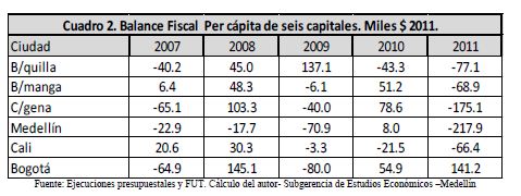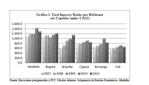 The article analyzes the evolution between 2007 and 2011, of the fiscal figures of the main six Colombian cities based on their earnings in 2011: Bogotá, Medellín, Cali, Barranquilla, Cartagena and Bucaramanga. The city that registered the largest advance