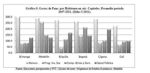Este artículo analiza la evolución entre 2007 y 2011, de las cifras fiscales de las seis ciudades con 05res ingresos en 2011 en Colombia: Bogotá, Medellín, Cali, Barranquilla, Cartagena y Bucaramanga. La ciudad que registró 05res progresos en términos de esfuerzo fiscal en el período analizado fue Barranquilla, seguida de Bucaramanga. Más recientemente, Cartagena también incrementó en forma destacable sus ingresos propios. Cuando se califica el desempeño fiscal con base en la magnitud del gasto por habitante que sea sostenible para las ciudades, Medellín se resalta en el primer lugar, seguida relativamente de cerca de Bogotá. Barranquilla y Cartagena vendrían después, con cierta distancia de las dos primeras; posteriormente Bucaramanga, y finalmente, y con un desempeño bastante pobre, Cali.