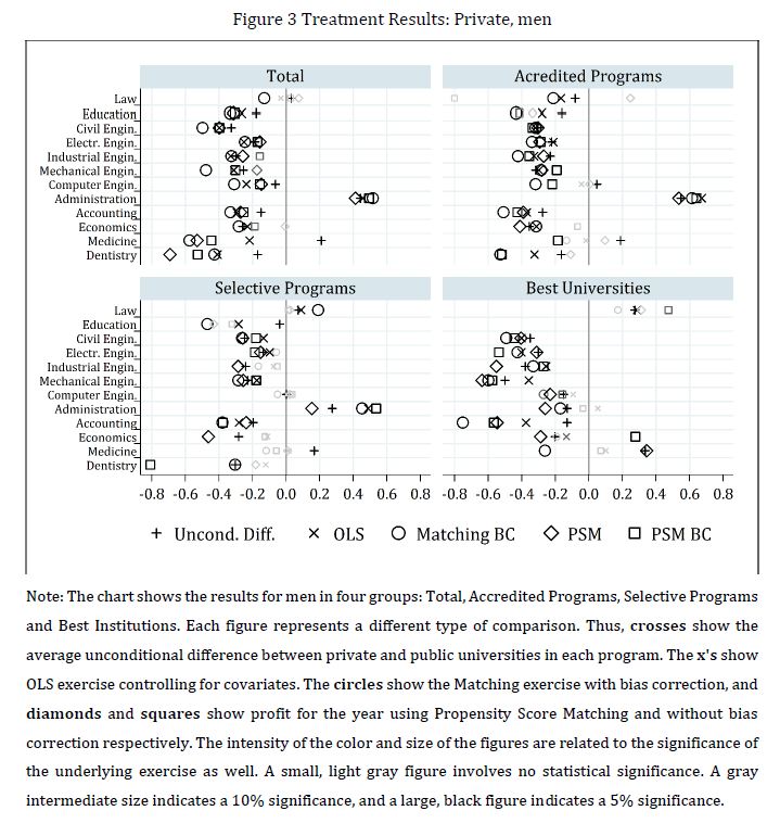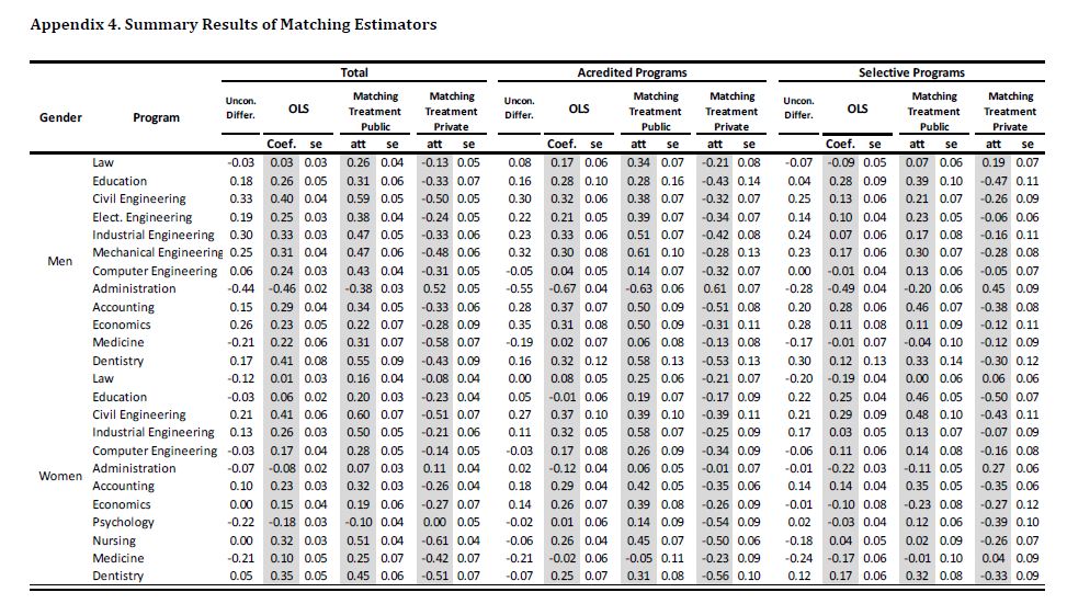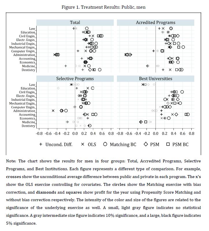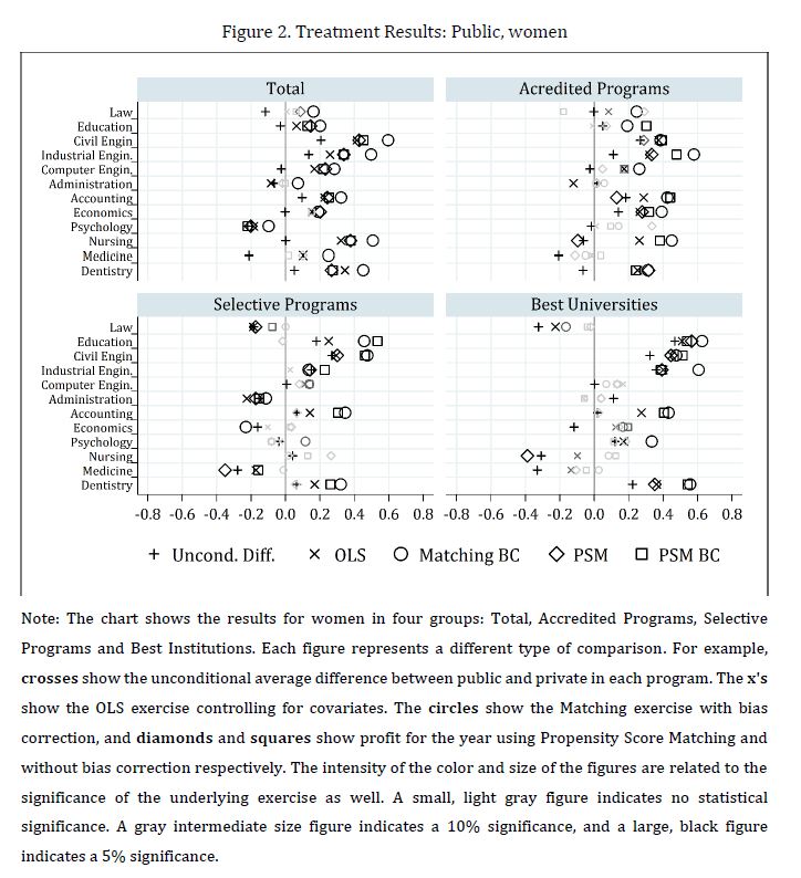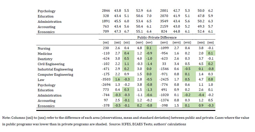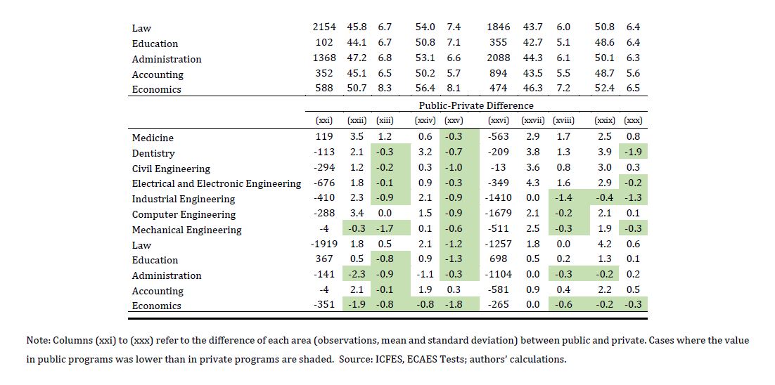 Se evalúa el impacto de asistir a una universidad pública sobre el rendimiento académico de los egresados de la educación superior en Colombia. El rendimiento académico se define como el progreso entre el examen de entrada a la universidad y los resultados de las pruebas estandarizadas justo antes de la graduación. Se encuentra que los programas de Instituciones de Educación Superior (IES) públicas mejoran los resultados de los estudiantes en 11 de los 12 programas analizados. La 05ría de los resultados son robustos una vez la muestra se condiciona a programas de 05r calidad (por ejemplo, programas acreditados o las mejores universidades del país). La superioridad de las IES públicas en relación con las privadas sugiere la necesidad de promover una 05r regulación de estas últimas y una revisión de sus estándares actuales para ayudar a superar la brecha existente en términos de valor agregado de las IES públicas en comparación con las privadas. También sugiere que, al menos en el corto plazo, podría ser socialmente beneficioso ampliar la provisión pública en algunos de los programas públicos de educación superior que agregaban más valor.