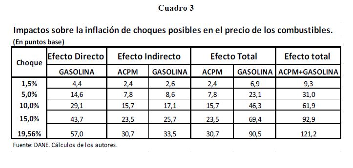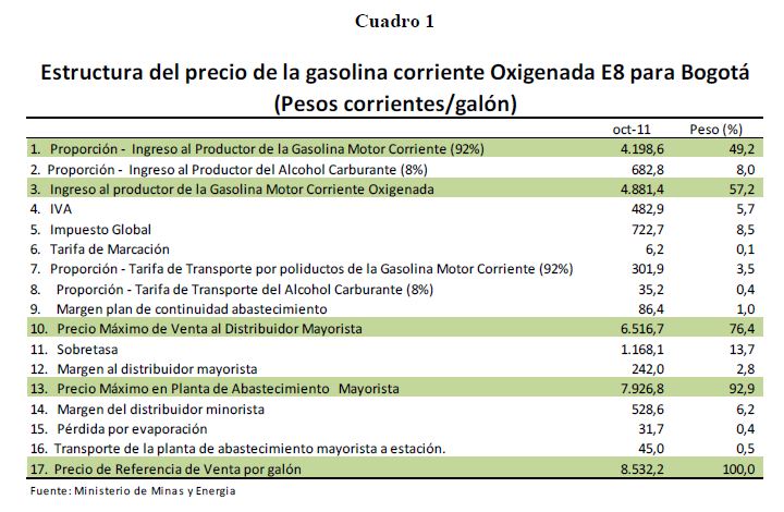 El objetivo de este documento es explicar el nuevo esquema para la fijación del precio máximo de venta al público de la gasolina automotor, establecido recientemente por el gobierno, y mediante un análisis insumo producto determinar su posible impacto sobre la inflación al consumidor. La nueva fórmula del precio al consumidor de la gasolina contempla una estructura con 4 componentes principales y tres criterios. La estructura no se modificó y está compuesta por el ingreso al productor, los costos de adicionar alcohol carburante, los impuestos y otros costos, incluidos los márgenes de comercialización. Los criterios, que es lo novedoso, contienen la definición de una tendencia, una brecha y topes a los ajustes en el precio local. El impacto inflacionario potencial, tomando los máximos incremento mensuales y anuales permitidos por la nueva fórmula, aumentaría la inflación anual al consumidor, por una sola vez, en 7 puntos base (p.b) en un mes o 91 p.b. en un año completo.