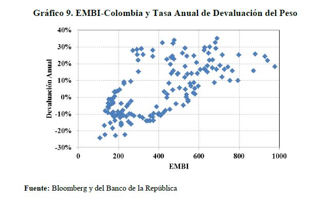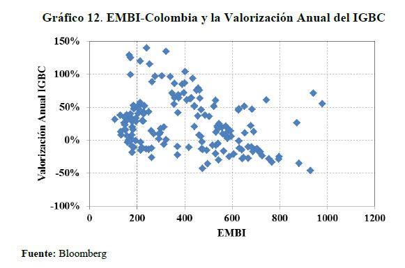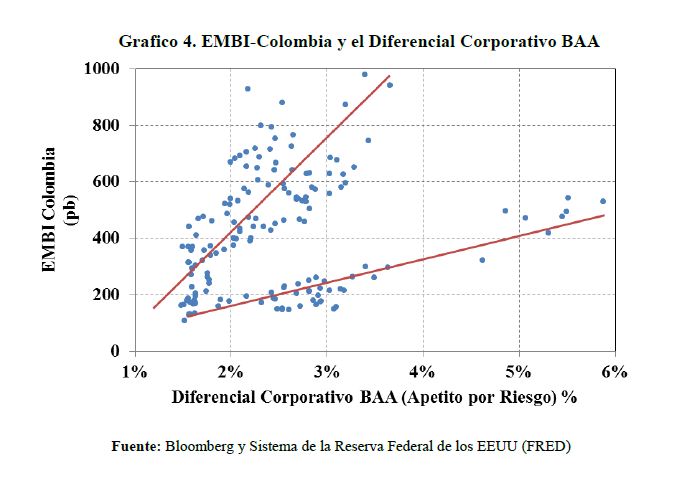 | dc.description | En este trabajo se muestra que el EMBI-Colombia está determinado por el apetito por riesgo de los inversionistas internacionales y que su respuesta es no lineal y está influenciada por la postura fiscal del gobierno. Se encuentra también que la relación entre estas variables sufrió un cambio estructural favorable en la mitad de la década del 2000, que parece estar asociado a los mejores fundamentales macroeconómicos locales y al deterioro del entorno internacional. Finalmente, se concluye que el riesgo soberano mantiene una relación unidireccional con la devaluación nominal y la valorización anual del IGBC, sugiriendo que el EMBI aporta la información básica para valorar las perspectivas de los mercados financieros locales. | spa |