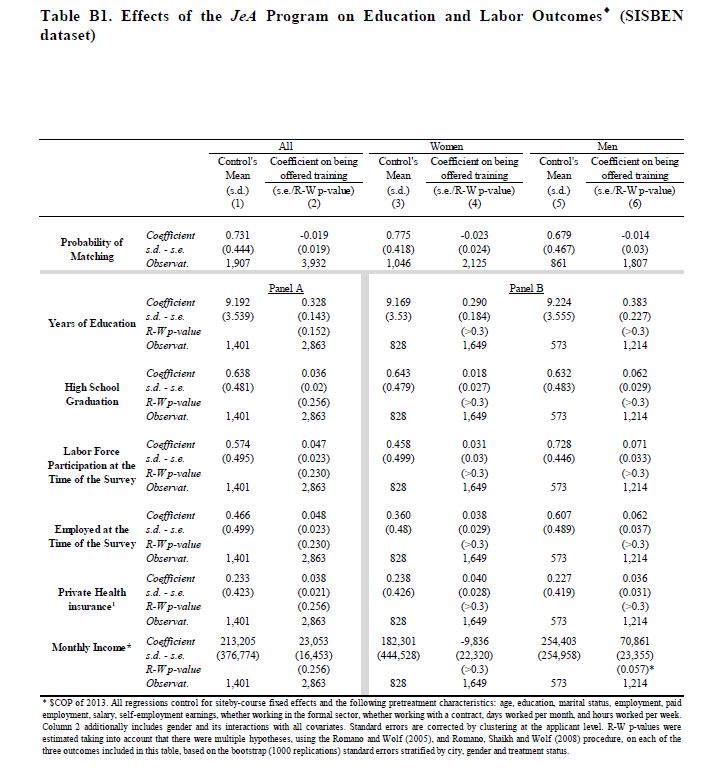 Con base en datos experimentales de un programa de formación para el trabajo implementado en 2005 Colombia, se encuentra que aun diez años después, el programa JeA tuvo un efecto positivo y significativo en la probabilidad de trabajar en el sector formal, y de trabajar en una firma grande. Los aplicantes en el grupo beneficiarios también contribuyeron más meses a seguridad social durante el período analizado. Los ingresos de los aplicantes beneficiarios fueron 11.8% más altos en el total de la muestra, e hicieron 05res contribuciones a la seguridad social. También presentamos cotas no paramétricas que muestran que para algunos percentiles de la muestra de mujeres, hay efectos positivos y cercanamente significativos del programa, por lo cual, los efectos del programa habrían sido capitalizados tanto en incrementos en la probabilidad de ser formales, como en la productividad. También se presenta evidencia de que los efectos estimados del programa en la probabilidad de trabajar para el sector formal, en la probabilidad de trabajar para una firma grande, y en los 05res ingresos en el sector formal, no son un artefacto de analizar múltiples resultados. Se encuentra que los beneficiarios tienen 0.315 años adicionales de educación, y tienen una probabilidad de graduarse de bachillerato 10% 05r. No se encuentran efectos significativos en la probabilidad de asistir a la universidad o cualquier otro programa académico, en decisiones de fertilidad, estado civil u otras dimensiones de segregación marital. Entre los aplicantes que se observaron en el censo de la población más pobre, se encuentra que los beneficiarios tienen 05r probabilidad de participar en el mercado laboral, de estar ocupados, y de tener seguro de salud privado al momento de la encuesta. Finalmente, se encuentra que los beneficios del programa JeA son 05res que sus costos, implicando tasas de retorno de al menos un 22.1%.