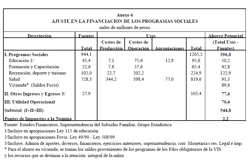 El problema del desempleo ha pasado a constituirse en el principal problema nacional del cuatrienio 2002-2006. Las empresas enfrentan sobre-cargas a la nómina equivalentes al 37.2%, después de los incrementos de la Ley 100 de 1993. En este trabajo argumentamos a favor de una reducción de 4 puntos porcentuales en los costos parafiscales, lo cual redundaría en la creación de entre 145,000 y 390,000 empleos adicionales por año. Las contribuciones parafiscales quedarían así: las Comfamiliares pasarían del 4% al 1%, donde 2 puntos constituirían un alivio tributario para las empresas que generan empleo formal y 1 punto sería redirigido a incrementar las contribuciones pensionales tanto públicas como privadas; la del SENA pasaría del 2% al 1%, dejando a las empresas decidir sobre los beneficios de destinar recursos adicionales a la capacitación laboral; y la del ICBF se reduciría del 3% al 2%, requiriéndose por parte del gobierno nacional de un gran esfuerzo por allegar presupuestalmente el equivalente a $200,000 millones (del año 2000), con el fin de continuar atendiendo las necesidades del ICBF, pero con el aliciente de derribar las barreras que obstaculizan la generación del empleo formal.