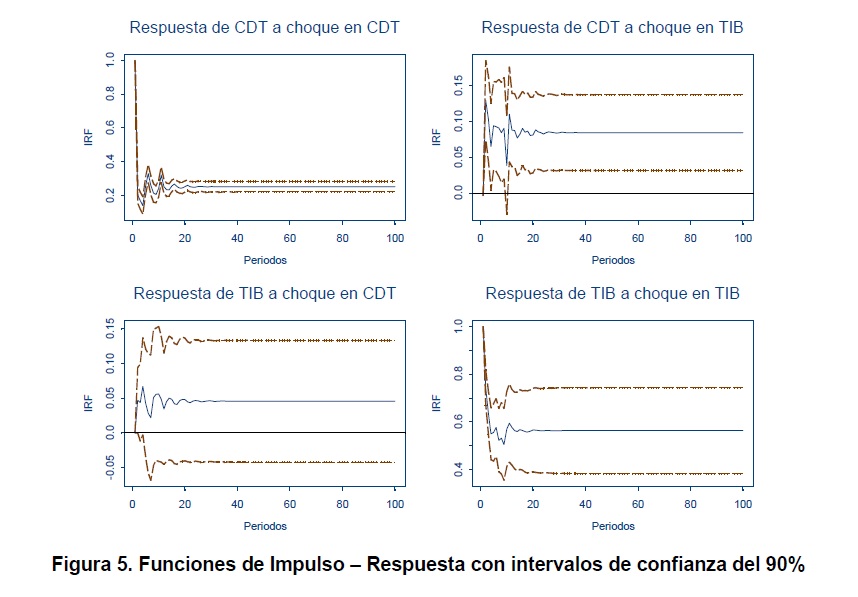 Este documento estudia una parte relevante del mecanismo de transmisión de la política monetaria asociado con el crédito bancario. Con tal objeto se estima un modelo VARXGARCH multivariado para establecer la relación, en frecuencia diaria, entre dos tasas de interés de corto plazo, la CDT y la TIB y una de las tasas de intervención del Banco de la República, la tasa de subasta de expansión, SEXP, en el periodo 01 de 2001 - septiembre de 2005. Este tipo de modelos tiene la ventaja de que no solo incorpora las interacciones entre los niveles (o variaciones) de estas series, si no que también modela las relaciones entre las volatilidades de las variables endógenas del modelo. Posteriormente, se realizan análisis de impulso respuesta en niveles (IRF y MA) y en volatilidades (VIRF). En niveles, se encuentra que la variable que más responde a choques sobre variables endógenas y exógenas del modelo, es la TIB. La respuesta de la tasa CDT ante un choque de 100 puntos básicos (p.b.) en SEXP oscila alrededor de 7 p.b., mientras que la respuesta de la TIB ante ese mismo choque es inicialmente de 68 p.b. y finalmente se estabiliza en 38 p.b.. Sin embargo, cuando se consideran muestras más recientes el efecto de SEXP sobre la TIB aumenta, lo cual indica una relación más estrecha entre los instrumentos de política y la meta operativa del BR. Para la muestra 2003-2005 la respuesta de la TIB a un choque en SEXP es inicialmente de 82 p.b. y converge a 56 p.b. Analizando los efectos cruzados, se observa que la respuesta de la TIB ante choques en la CDT es casi nula, mientras la CDT responde de manera significativa a choques en la TIB. Es así, como un aumento de 100 p.b. en la TIB incrementa aproximadamente 8.5 p.b. la tasa CDT. Todos estos efectos son permanentes. El análisis VIRF es realizado para diferentes tipos de choques. Sin embargo, los resultados muestran que no existen patrones claramente diferenciables para los distintos tipos de choques analizados. Esto indica que con respecto a otros tipos de choques, los que realiza el Banco Central a través de cambios en la tasa de subasta de expansión no afectan de manera diferente las volatilidades de las series. También se encuentra que en términos de volatilidad la variable que presenta una 05r respuesta ante diferentes choques al igual que en choques en niveles es la TIB, con un efecto aproximado de tres meses. Adicionalmente, al comparar los efectos sobre la volatilidad de la TIB con los de la CDT, se observa que aunque la magnitud de respuesta de la volatilidad de la tasa CDT es menor, su persistencia es más alta.