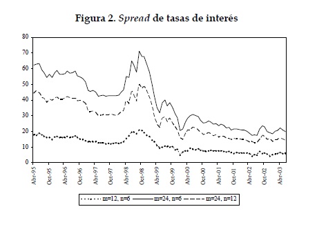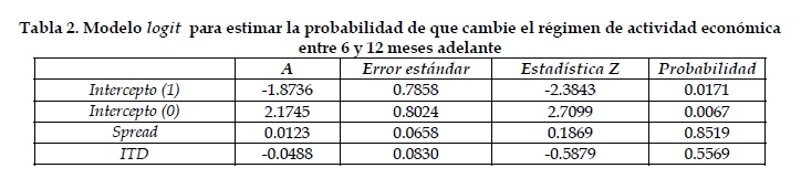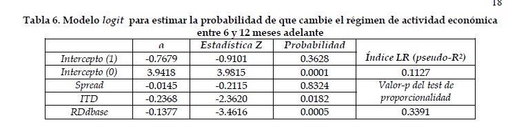 En relación con los síntomas que probablemente tendrá la actividad económica en el futuro, un aumento en el spread de tasas de interés reduce la probabilidad de tener momentos difíciles mas adelante. Este resultado se cumple para un período 12 y 24 meses adelante y se ajusta al modelo teórico utilizado. La inclusión de variables monetarias en el modelo empírico no afecta la significancia estadística ni los signos del spread ni del diferencial de inflación. Sin embargo, el crecimiento monetario también contiene información sobre el ambiente económico futuro.