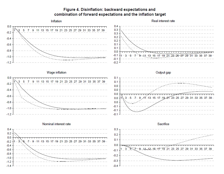 Wage increases based on past inflation increase inflation inertia and hence increase the cost of disinflation. Higher central bank credibility and a higher frequency of wage negotiations correspond to lower inflation inertia and a lower cost of disinflati