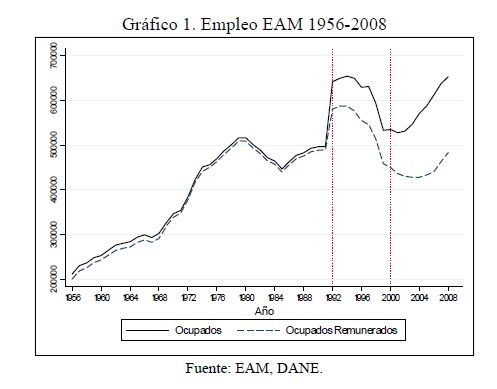 Este trabajo utiliza un panel de firmas de la industria Colombiana para analizar las principales variables que inciden en la dinámica de la demanda laboral en los periodos 1993-2009 y 2000-2009. Se estiman funciones de demanda dinámicas a través de metodologías estándar y mediante modelos Panel VAR, y se encuentra: (i) una fuerte persistencia en el empleo, particularmente del no obrero, (ii) una alta sensibilidad por parte de la demanda de empleo ante un choque sobre la producción de la firma, en especial para el empleo no obrero, (iii) la respuesta del empleo obrero a su salario es significativamente 05r a la encontrada para el empleo no obrero, y (iv) el salario directo genera choques negativos sobre el empleo, aunque con 05r fuerza en el empleo obrero.