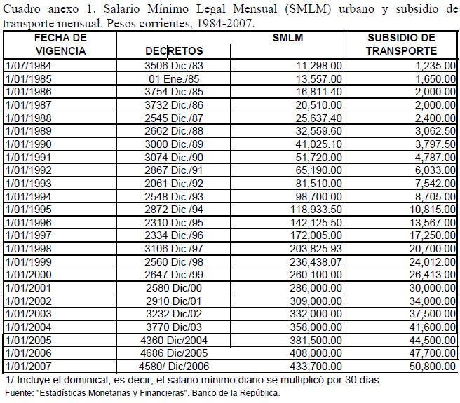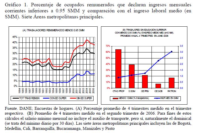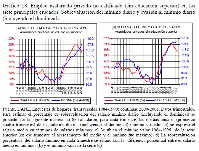 Este artículo pretende examinar -con base en las series trimestrales, 1984-2006, de las encuestas de hogares del DANE para las siete principales áreas metropolitanas de Colombia- el grado de evasión al salario mínimo legal (SML) en Colombia; se ocupa también de las estrategias que han puesto en práctica las empresas privadas (05r uso de horas extras, recomposición del empleo en contra de los trabajadores jóvenes sin educación superior, incremento en la evasión) para evitar que las alzas que se produjeron desde 1993/94 en los salarios indirectos y, desde 1999, en el mínimo real, se trasladaran al salario medio; se ocupa también de la relación entre el salario mínimo y la pobreza. Sugiere que, en vez de elevar adicionalmente el mínimo real es preferible incidir en su acatamiento legal mediante una 05r inspección y vigilancia, sobre todo para el dominical y el auxilio de transporte.