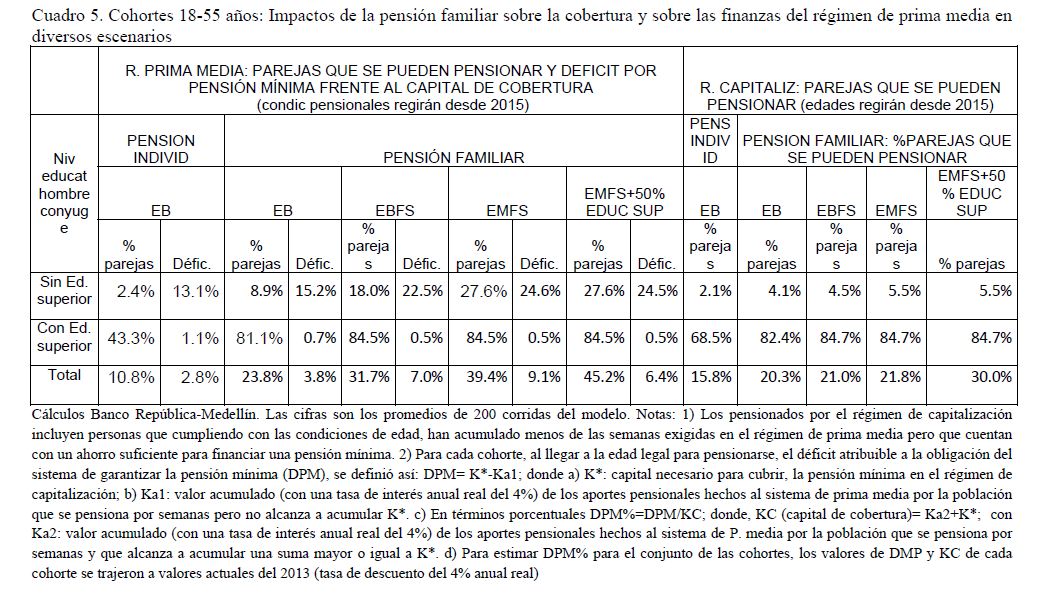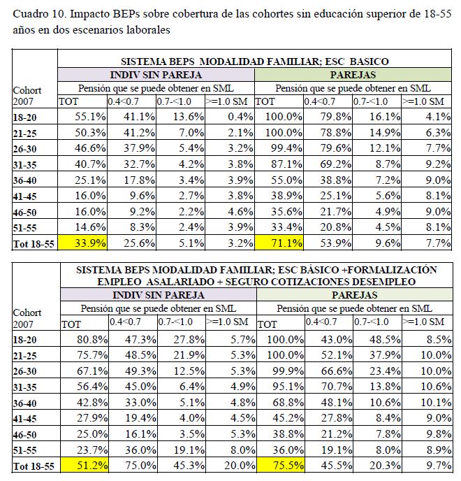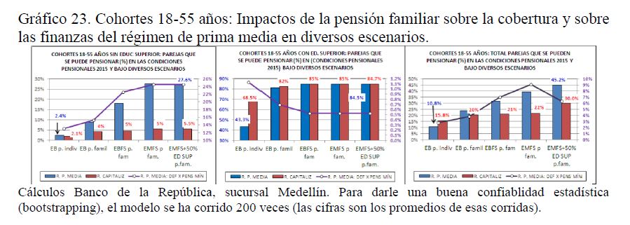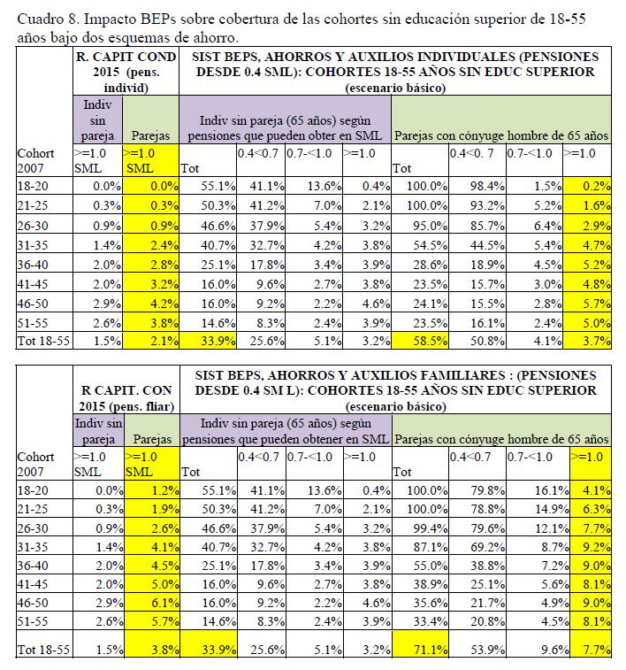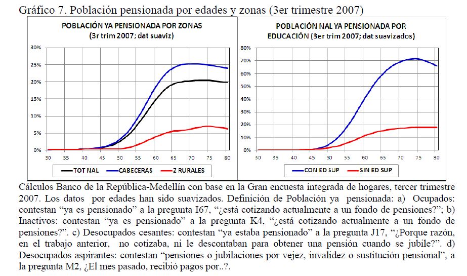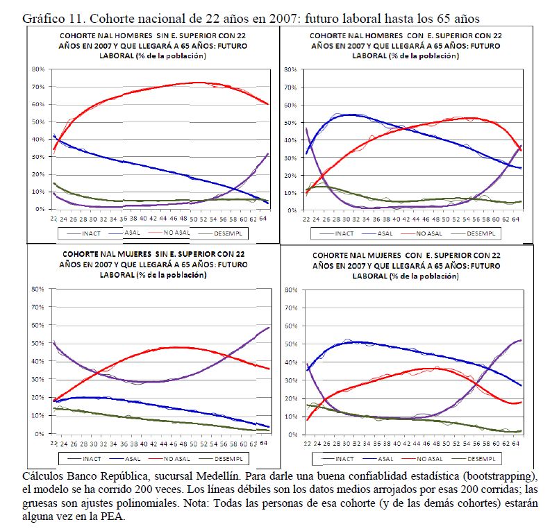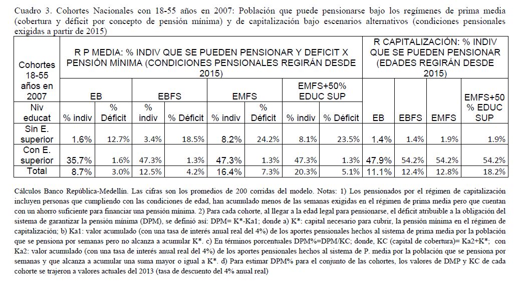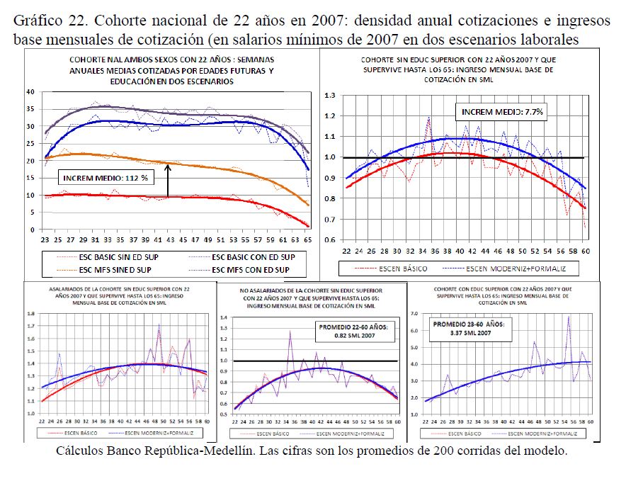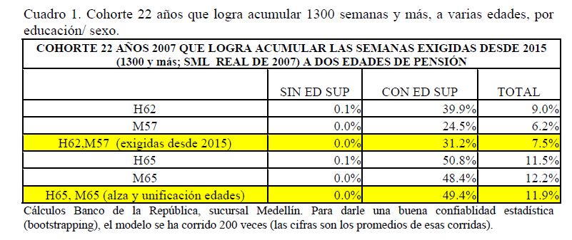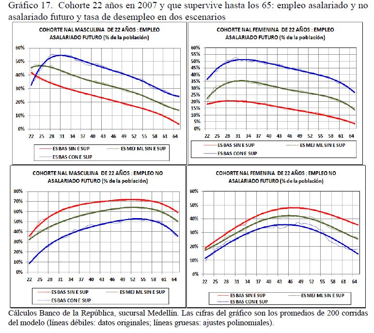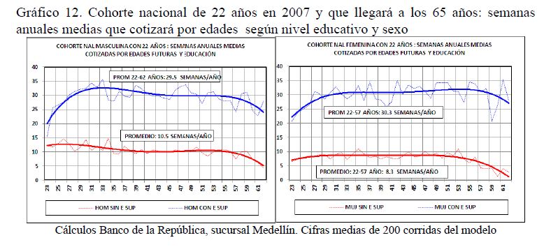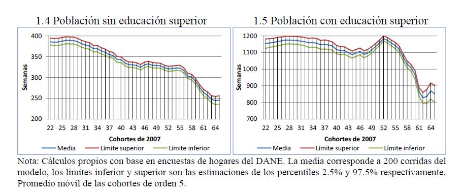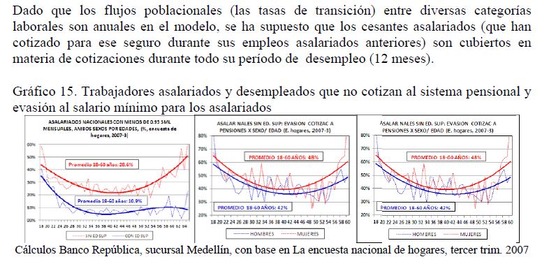 Este artículo examina el problema que plantea la cobertura pensional de los colombianos menos educados y más vulnerables. Relaciona las tendencias del mercado laboral con la baja cobertura pensional: el sesgo del empleo urbano moderno contra los menos educados ha generado para estos un ciclo de vida laboral muy marcado (empleo asalariado para los jóvenes, informal para los adultos): durante su fase asalariada temprana perciben ingresos relativamente mejores y, salvo en los períodos de desempleo, cotizan más al sistema pensional; durante su fase madura como informales perciben ingresos más bajos y dejan de cotizar. Ello, junto con la bajísima calidad del empleo rural, explica la baja cobertura pensional. Hemos diseñado un modelo para estimar el futuro laboral y pensional de cada uno de los 167.304 individuos en edad de trabajar existentes en la muestra de la encuesta nacional de hogares del DANE del tercer trimestre de 2007. Para ello ha sido necesario calcular su supervivencia hasta los 65 años, las probabilidades anuales de transición entre asalariados, no asalariados, desempleados e inactivos, por edades simples, sexo y nivel educativo y también, con base en la información de esa encuesta de hogares, las semanas y sumas monetarias cotizadas por cada uno. Dados los resultados (solo los más educados podrán pensionarse en proporciones significativas, los menos educados no) y con el fin de elevar la cobertura para estos últimos, hemos considerado una serie de modificaciones al mercado laboral colombiano y examinado también los impactos de la pensión familiar. Los resultados, que son bastante decepcionantes (la cobertura no sube mucho ni bajo el régimen de capitalización, ni bajo el de prima media a menos que este último se deficite peligrosamente), revelan que, aunque la densidad de cotizaciones se eleva significativamente y los salarios de los obreros y empleados suben cuando se formaliza en el empleo asalariado, resultan insuficientes dados los bajísimos ingresos de los trabajadores informales; sin embargo, bajo el régimen de capitalización y excluyendo la garantía de pensión mínima, el escenario más optimista (que incluye un alza del 50% en la educación superior) mejora sustancialmente la cobertura pensional global; lo hace al garantizar a la población empleos de altos salarios y con 05res densidades de cotización. Por eso, el artículo se ocupa también finalmente de los impactos de los beneficios económicos periódicos sobre las posibilidades pensionales de la población menos educada.