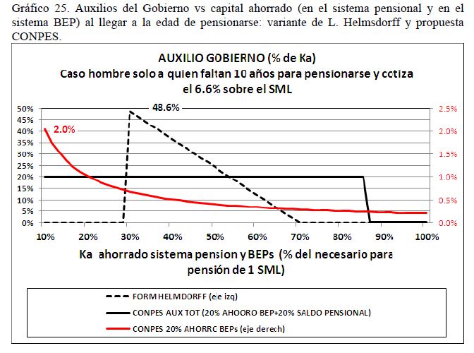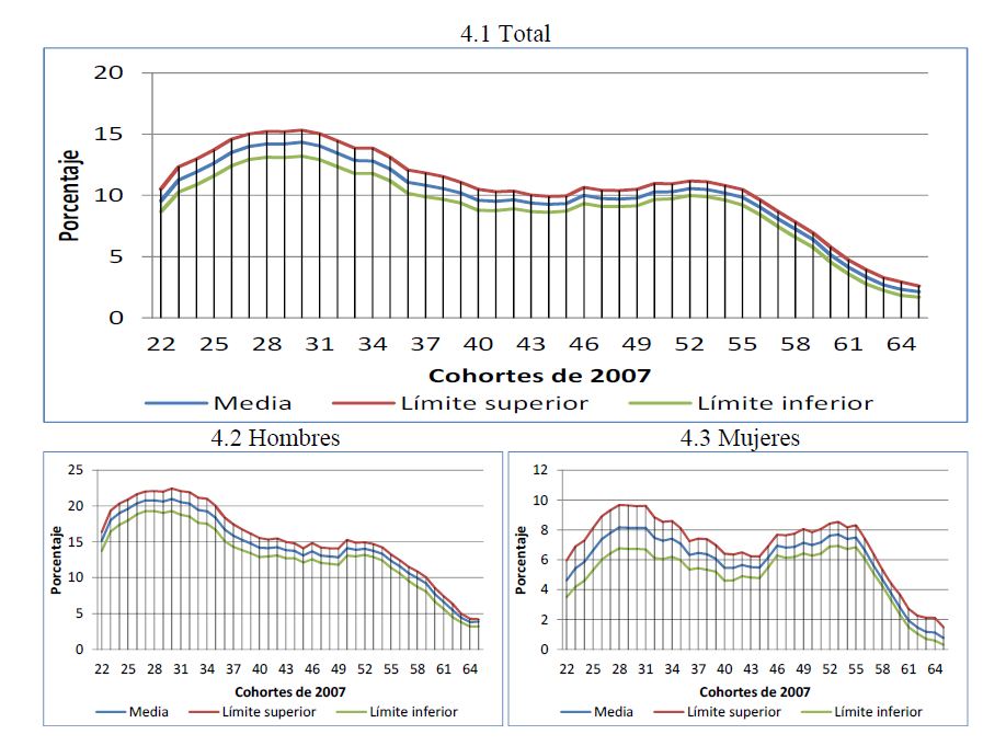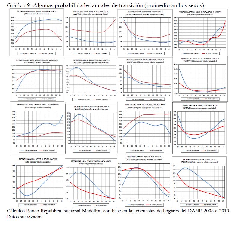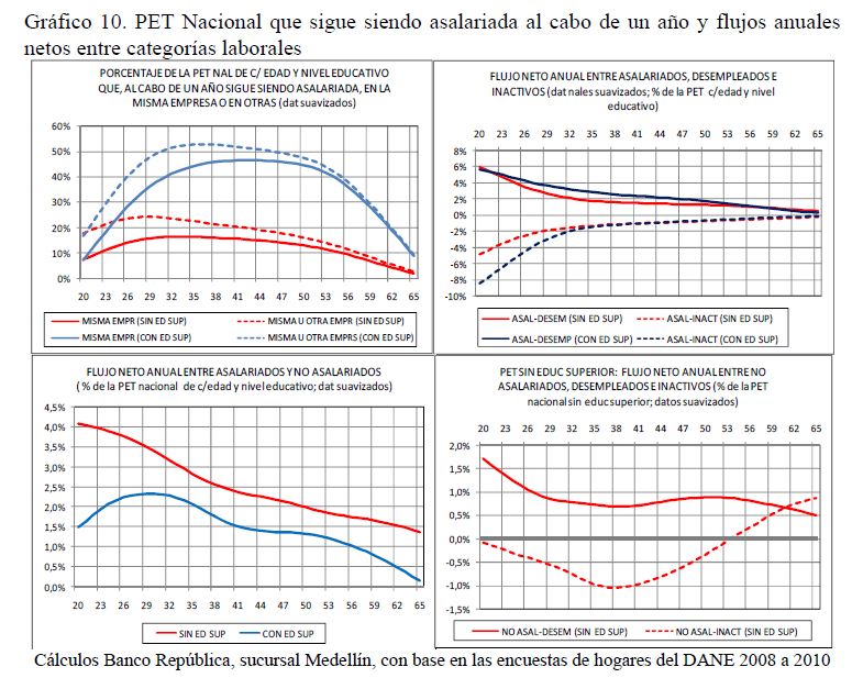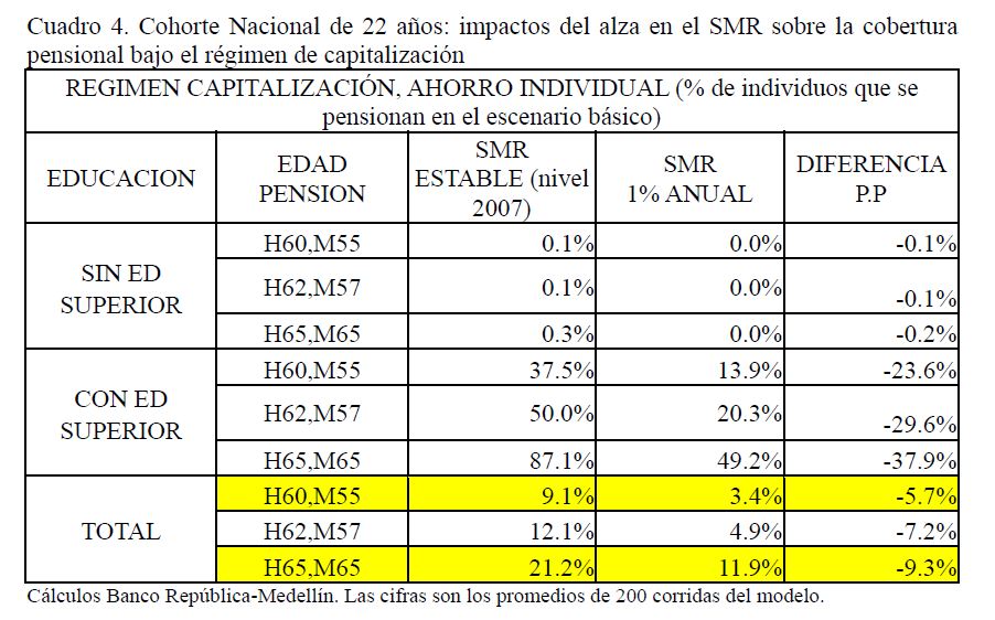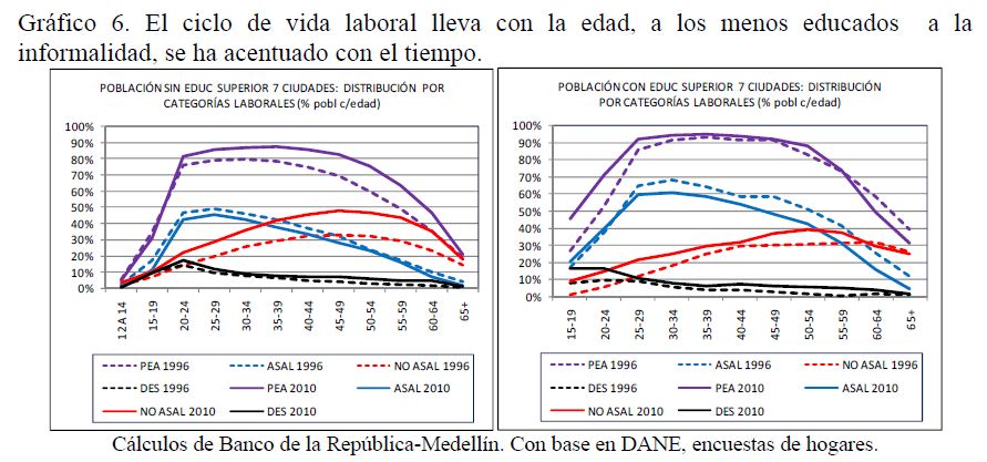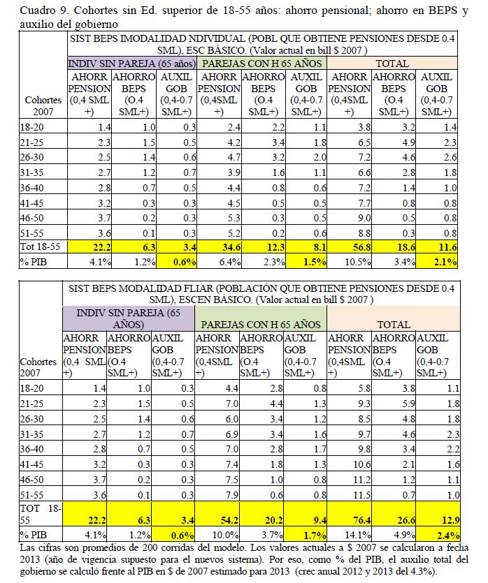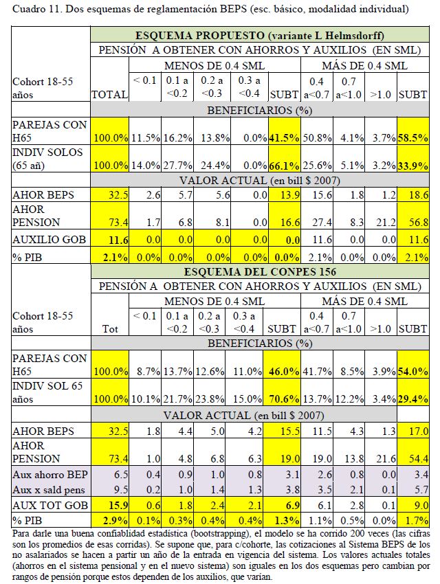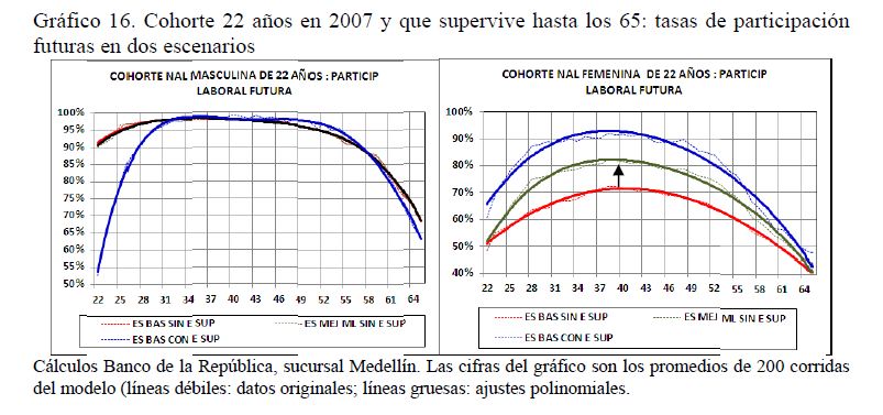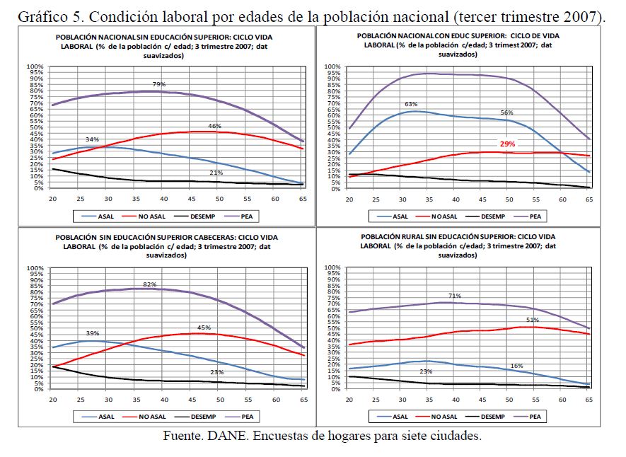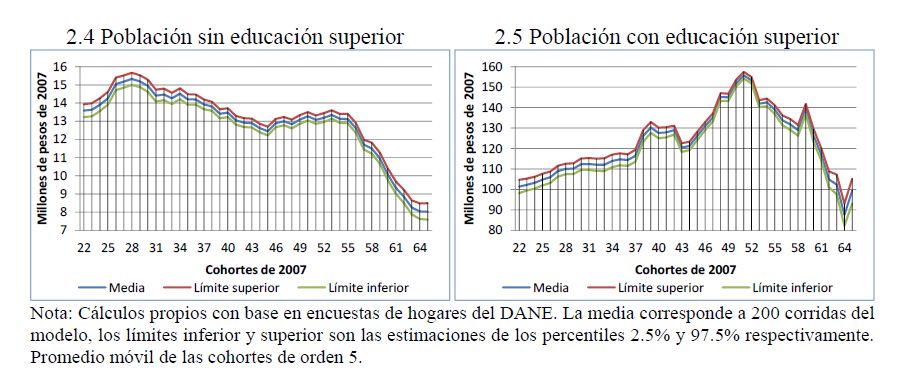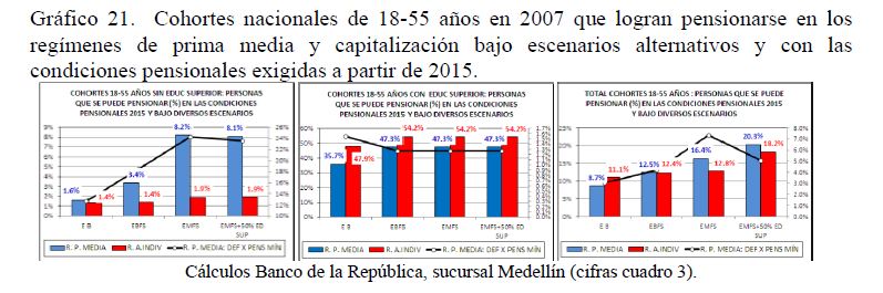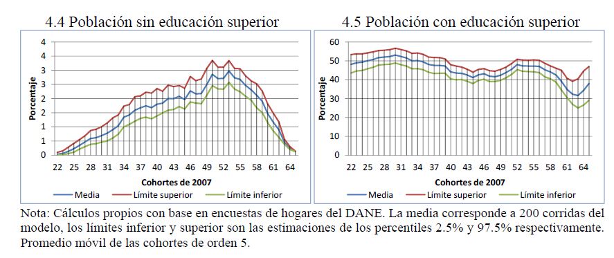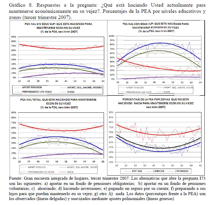 Este artículo examina el problema que plantea la cobertura pensional de los colombianos menos educados y más vulnerables. Relaciona las tendencias del mercado laboral con la baja cobertura pensional: el sesgo del empleo urbano moderno contra los menos educados ha generado para estos un ciclo de vida laboral muy marcado (empleo asalariado para los jóvenes, informal para los adultos): durante su fase asalariada temprana perciben ingresos relativamente mejores y, salvo en los períodos de desempleo, cotizan más al sistema pensional; durante su fase madura como informales perciben ingresos más bajos y dejan de cotizar. Ello, junto con la bajísima calidad del empleo rural, explica la baja cobertura pensional. Hemos diseñado un modelo para estimar el futuro laboral y pensional de cada uno de los 167.304 individuos en edad de trabajar existentes en la muestra de la encuesta nacional de hogares del DANE del tercer trimestre de 2007. Para ello ha sido necesario calcular su supervivencia hasta los 65 años, las probabilidades anuales de transición entre asalariados, no asalariados, desempleados e inactivos, por edades simples, sexo y nivel educativo y también, con base en la información de esa encuesta de hogares, las semanas y sumas monetarias cotizadas por cada uno. Dados los resultados (solo los más educados podrán pensionarse en proporciones significativas, los menos educados no) y con el fin de elevar la cobertura para estos últimos, hemos considerado una serie de modificaciones al mercado laboral colombiano y examinado también los impactos de la pensión familiar. Los resultados, que son bastante decepcionantes (la cobertura no sube mucho ni bajo el régimen de capitalización, ni bajo el de prima media a menos que este último se deficite peligrosamente), revelan que, aunque la densidad de cotizaciones se eleva significativamente y los salarios de los obreros y empleados suben cuando se formaliza en el empleo asalariado, resultan insuficientes dados los bajísimos ingresos de los trabajadores informales; sin embargo, bajo el régimen de capitalización y excluyendo la garantía de pensión mínima, el escenario más optimista (que incluye un alza del 50% en la educación superior) mejora sustancialmente la cobertura pensional global; lo hace al garantizar a la población empleos de altos salarios y con 05res densidades de cotización. Por eso, el artículo se ocupa también finalmente de los impactos de los beneficios económicos periódicos sobre las posibilidades pensionales de la población menos educada.