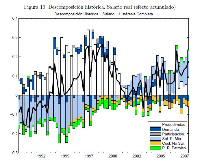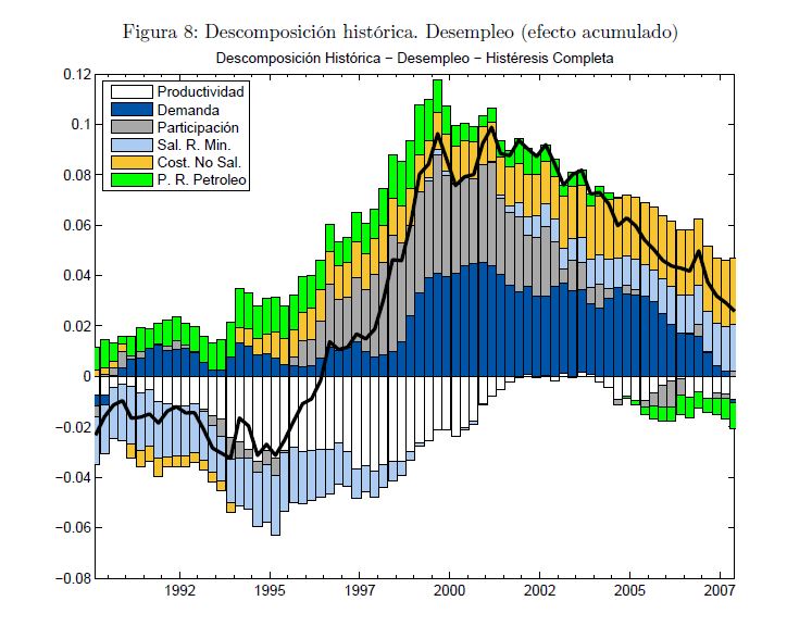 Este trabajo utiliza la metodología VAR-X estructural para explicar por qué creció el desempleo en Colombia desde niveles cercanos a 7 % en 1995:1 hasta 19 % en 2000:1, y por qué permaneció en niveles de dos dígitos durante la década siguiente. Se trató de una combinación desafortunada de choques y de instituciones laborales mal diseñadas para enfrentarlos. La participación laboral se incrementó fuertemente desde comienzos de los 1990s por motivos demográficos y como respuesta a la crisis de 1998-2000; la demanda cayó abruptamente en esos mismos años, debido a la parada súbita de flujos de capital y a una política fiscal y monetaria pro-cíclica; y la dinámica de la productividad ha sido excesivamente lenta, principalmente en los 2000s. Los costos no salariales y el salario mínimo real también han jugado un papel importante en la explicación del nivel y de la persistencia del desempleo.