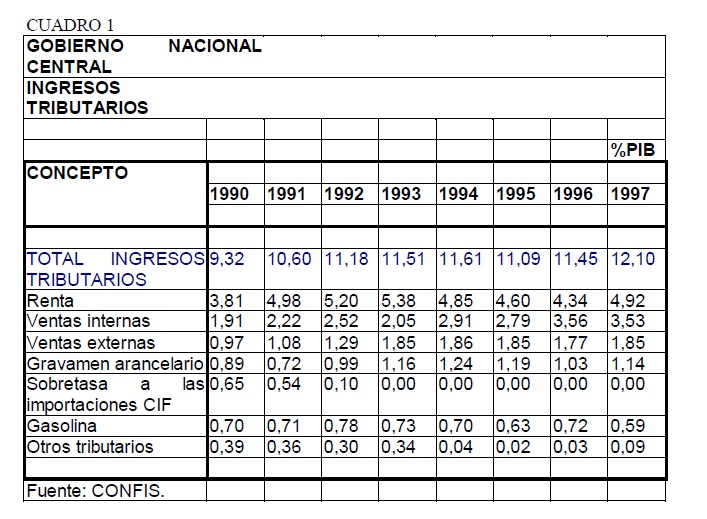 Colombia se comprometió en los noventa con una serie de reformas estructurales y de redistribución del poder político, en la dirección de reducir la discriminación contra las importaciones y de tasar las actividades más en sentido de su contribución o freno al crecimiento económico, al tiempo que ocurría una descentralización del gasto. Lo anterior debía acompañarse con un aumento de los impuestos internos al valor agregado, en forma abierta y no subrepticia, donde todos los bienes serían ajustados según criterios objetivos y no de origen nacional. El fin era permitir que se manifestaran mejor las ventajas comparativas que tenía el país frente al mundo y que canalizara hacia ellas el grueso de su ahorro. El Estado debía aumentar de tamaño y proveer eficientemente los bienes públicos, descentralizando sus funciones. Los resultados del decenio fueron, como se verá, distintos a los propuestos.