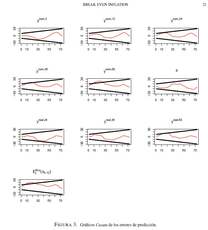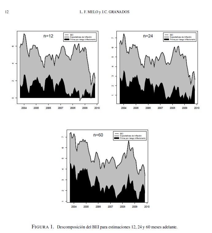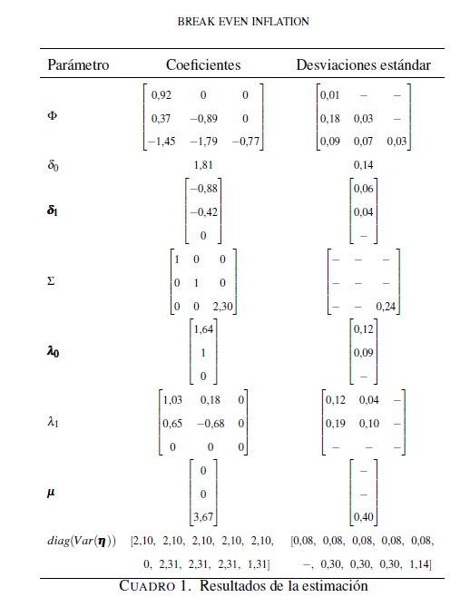 En este documento se estima una medida de compensación inflacionaria (Break Even Inflation) usando los rendimientos de los TES en pesos y de los TES indexados a la UVR para el periodo comprendido entre 01 de 2003 y noviembre de 2009. Esta medida se descompone en expectativas de inflación y prima por riesgo inflacionario. Las expectativas de inflación se calculan con base en la representación de estado espacio de un modelo afín de estructura a término extendido. Este relaciona la rentabilidad de los bonos nominales y reales, a distintas maduraciones, con la inflación observada y dos factores no observables. Con el objeto de mejorar los pronósticos, este modelo incorpora las expectativas de inflación a 12 meses de la encuesta mensual del Banco de la República. Los resultados muestran una tendencia a la baja de las expectativas de inflación. Esto se puede deber al aumento de la confianza en la política monetaria por parte de los agentes. Otro resultado que soporta esta hipótesis es que la prima por riesgo inflacionario presenta una tendencia decreciente a lo largo de la muestra para horizontes de tiempo de mediano y largo plazo (2 y 5 años). Adicionalmente, los resultados indican que a corto plazo, el break even es un buen indicador de expectativas de inflación. Sin embargo, para el mediano y largo plazo esto no se cumple dado que la prima por riesgo inflacionario toma relevancia para 05res periodos de maduración.