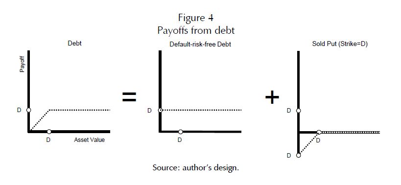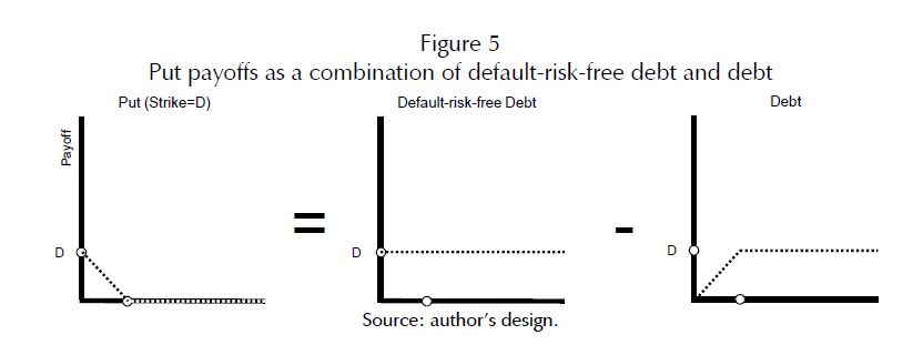 market value of the sold put option that makes risky debt trade below default-risk-free debt. In